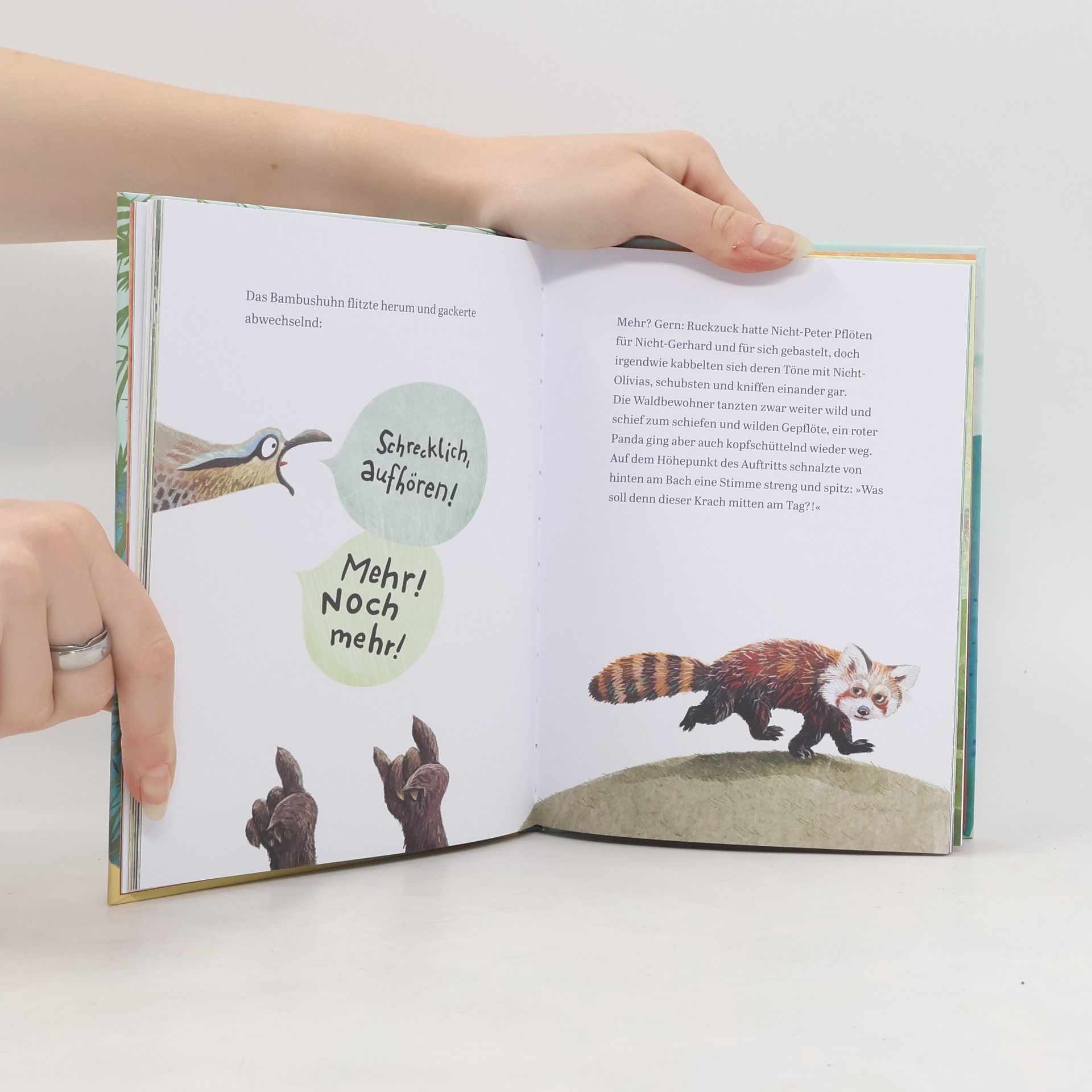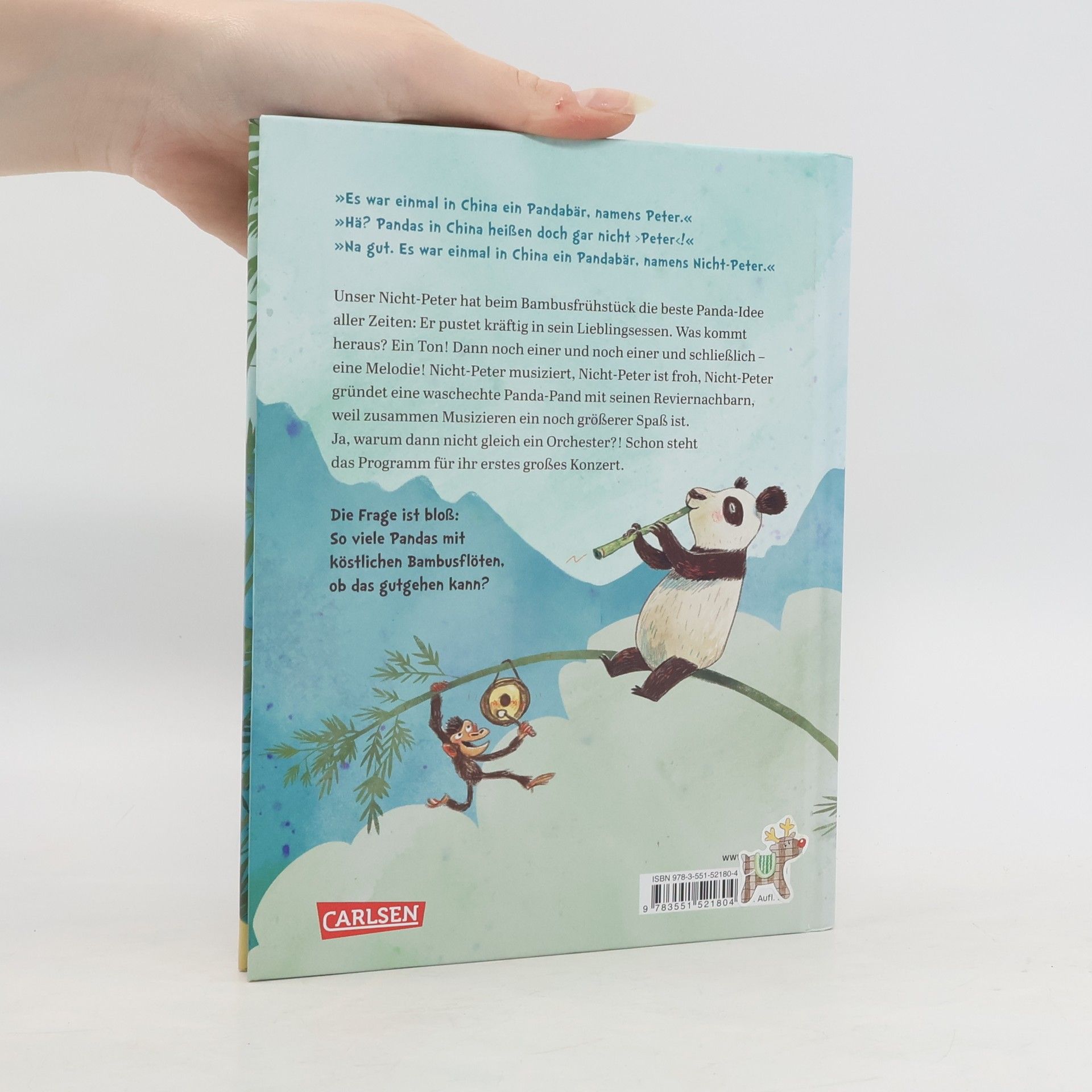 Pandabär Nicht-Peter knabbert beim Frühstück genüsslich an einem Bambusrohr – und hat die beste Panda-Idee aller Zeiten! Er pustet kräftig in sein Lieblingsessen. Was kommt heraus? Erst ein Ton, dann zwei und schließlich die schönste Melodie der Welt.Aber so ganz allein macht das Musizieren keinen Spaß. Also startet er mit seinen Freunden eine Panda-Pand. Damit ist die Langeweile-Pandamie vergessen. Und der Konzerttermin steht. Die Frage ist nur: So viele Pandas mit Bambusflöten, ob das gutgehen kann? Die riechen doch so lecker …