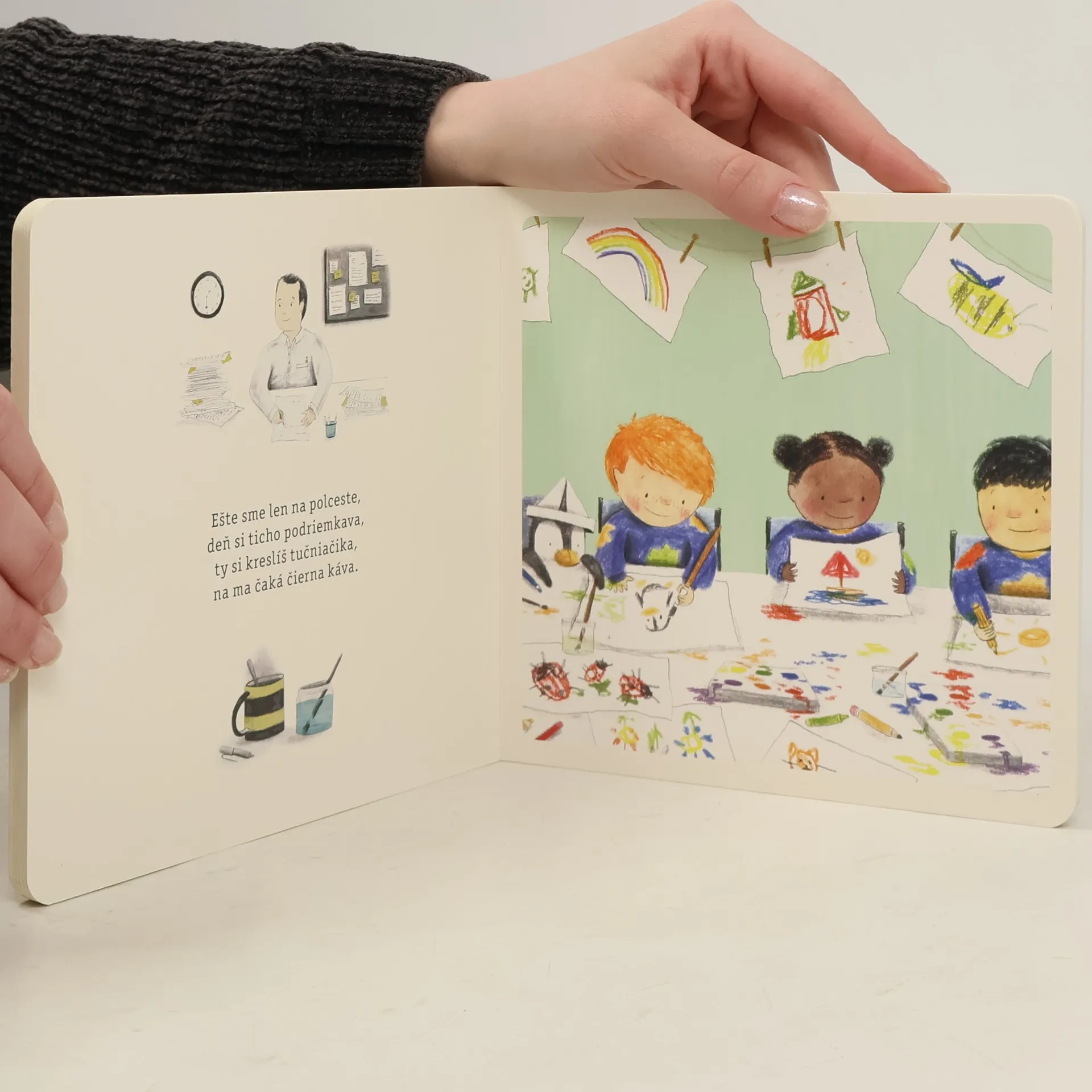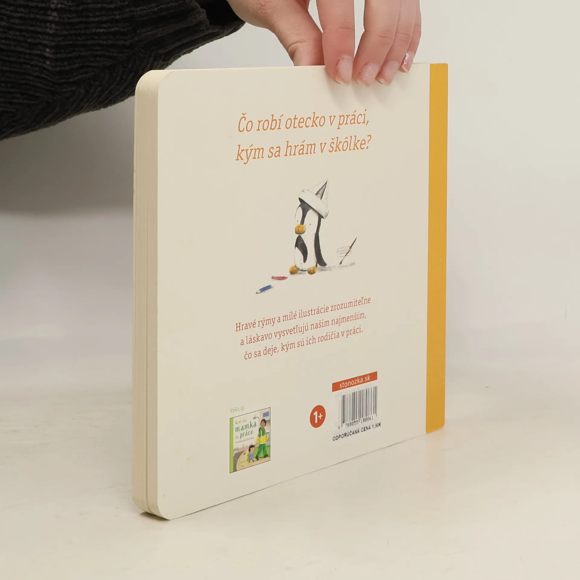 Čo robí otecko v práci, kým sa hrám v škôlke? Hravé rýmy a milé ilustrácie zobrazujú paralely medzi pracovným dňom ocka a dňom synčeka v škôlke. Zrozumiteľne vysvetľujú, čo sa deje v živote rodiča, keď chodí do práce, a že na svoje dieťa nezabúda pri žiadnej činnosti. Z anglického originálu preložila Marta Hlušíková. Pre deti od 1 roka.