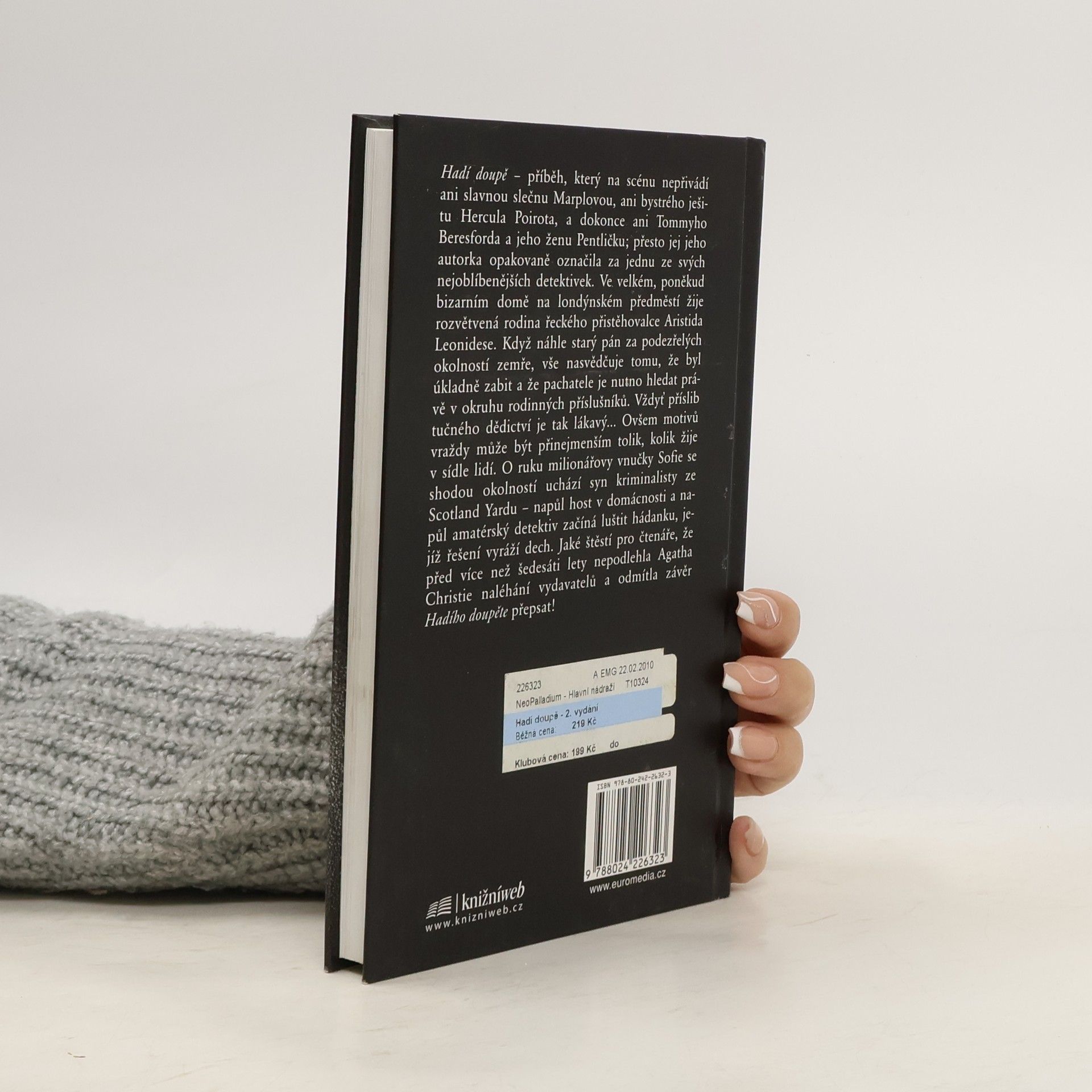 Hadí doupě – příběh, který na scénu nepřivádí ani slavnou slečnu Marplovou, ani bystrého ješitu Hercula Poirota, a dokonce ani Tommyho Beresforda a jeho ženu Pentličku; přesto jej jeho autorka opakovaně označila za jednu ze svých nejoblíbenějších detektivek. Ve velkém, poněkud bizarním domě na londýnském předměstí žije rozvětvená rodina řeckého přistěhovalce Aristida Leonidese. Když náhle starý pán za podezřelých okolností zemře, vše nasvědčuje tomu, že byl úkladně zabit a že pachatele je nutno hledat právě v okruhu rodinných příslušníků. Vždyť příslib tučného dědictví je tak lákavý… Ovšem motivů vraždy může být přinejmenším tolik, kolik žije na sídle lidí. O ruku milionářovy vnučky Sofie se shodou okolností uchází syn kriminalisty ze Scotland Yardu – napůl host v domácnosti a napůl amatérský detektiv začíná luštit hádanku, jejíž řešení vyráží dech. Jaké štěstí pro čtenáře, že před více než padesáti lety nepodlehla Agatha Christie naléhání vydavatelů a odmítla závěr Hadího doupěte přepsat! Přeložil Karel Voleský. Vydání třetí.