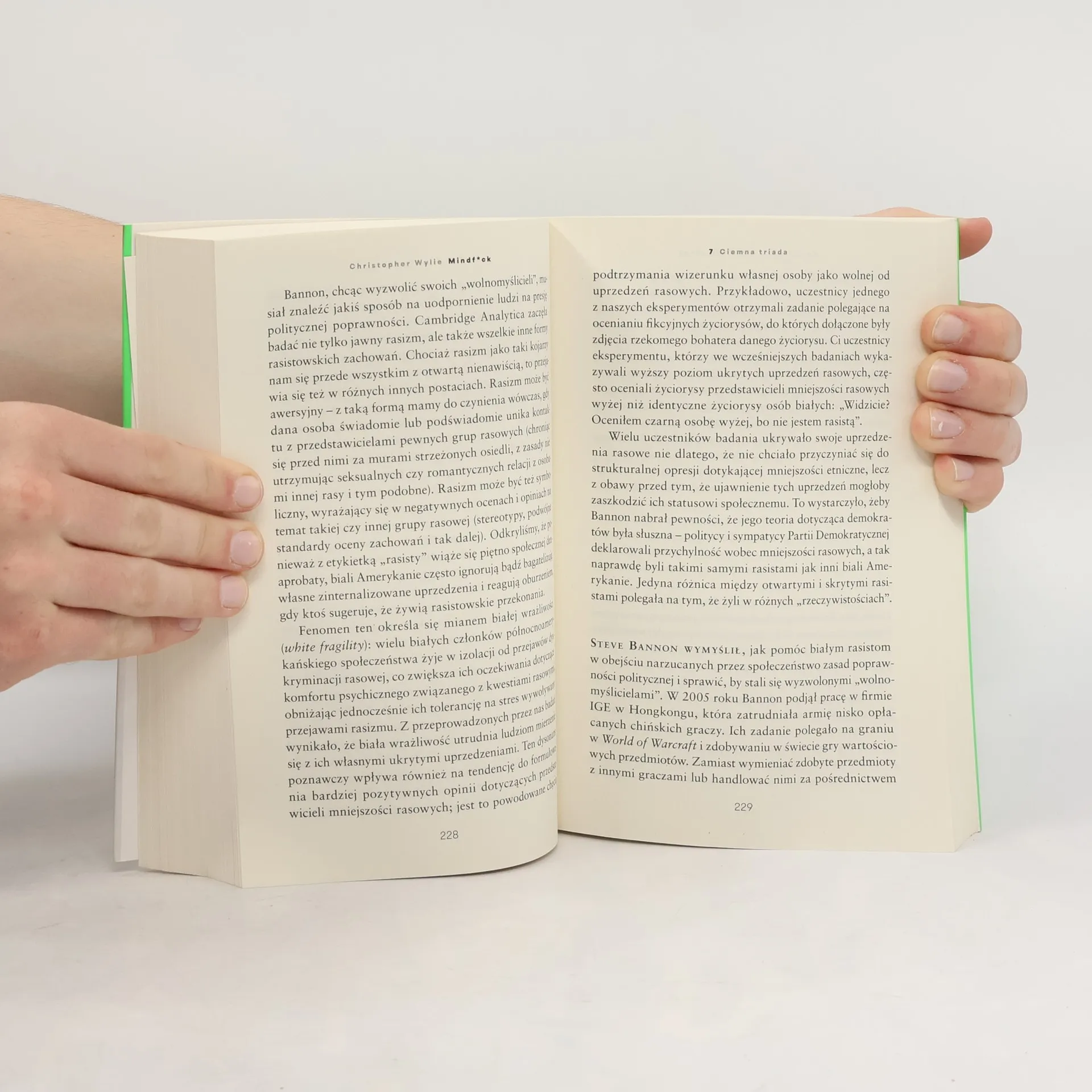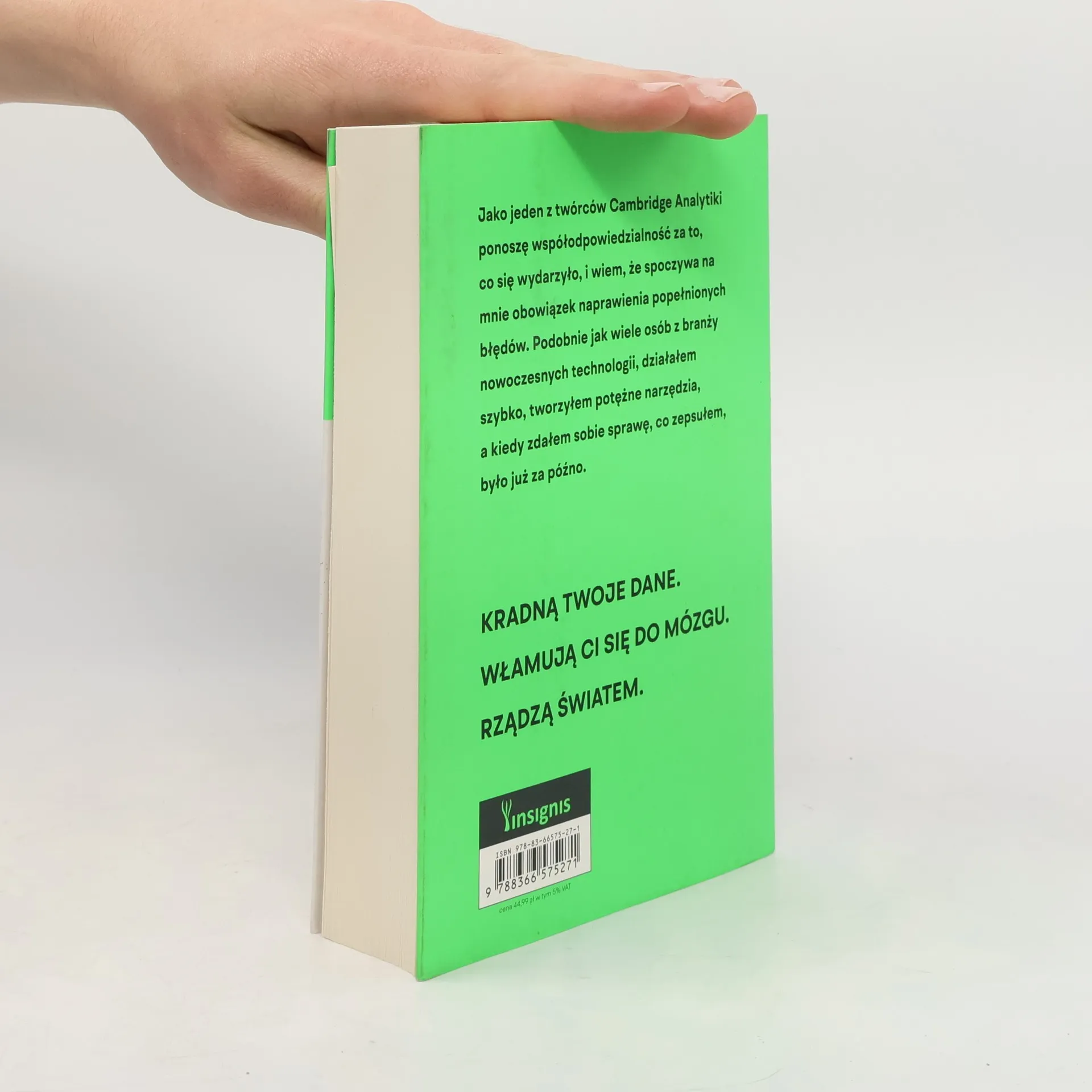 KRADNĄ TWOJE DANE. WŁAMUJĄ CI SIĘ DO MÓZGU. RZĄDZĄ ŚWIATEM. Jako jeden z twórców Cambridge Analytiki ponoszę współodpowiedzialność za to, co się wydarzyło, i czuję obowiązek naprawienia popełnionych błędów. Działałem szybko, tworząc potężne narzędzia, a gdy zdałem sobie sprawę z konsekwencji, było już za późno. 17 marca 2018 roku Christopher Wylie ujawnia się jako sygnalista w jednej z największych afer politycznych ostatnich lat. Jego informacje o działaniach Cambridge Analytiki, brytyjskiej firmy doradztwa politycznego, ujawniają wpływ na Brexit oraz wybory w USA. Choć na pierwszy rzut oka Wylie wydaje się mało prawdopodobnym graczem w nieuczciwych operacjach, jego historia jest kluczowa. Miał zaledwie 24 lata, gdy stworzył zespół naukowców do walki z ekstremizmem w sieci, a narzędzia te szybko zaczęły być wykorzystywane do celów politycznych. Cambridge Analytica, finansowana przez Roberta Mercera, realizowała wizję Steve'a Bannona, wykorzystując dane z Facebooka, by spolaryzować amerykańskie społeczeństwo. Wylie doprowadził do dochodzenia, które ujawnia powiązania między Cambridge Analytiką, Donaldem Trumpem, Facebookiem i międzynarodowymi hakerami. To nie tylko pasjonująca publikacja demaskatorska, ale także ostrzeżenie o zagrożeniach nowoczesnych technologii i manipulacji danymi.