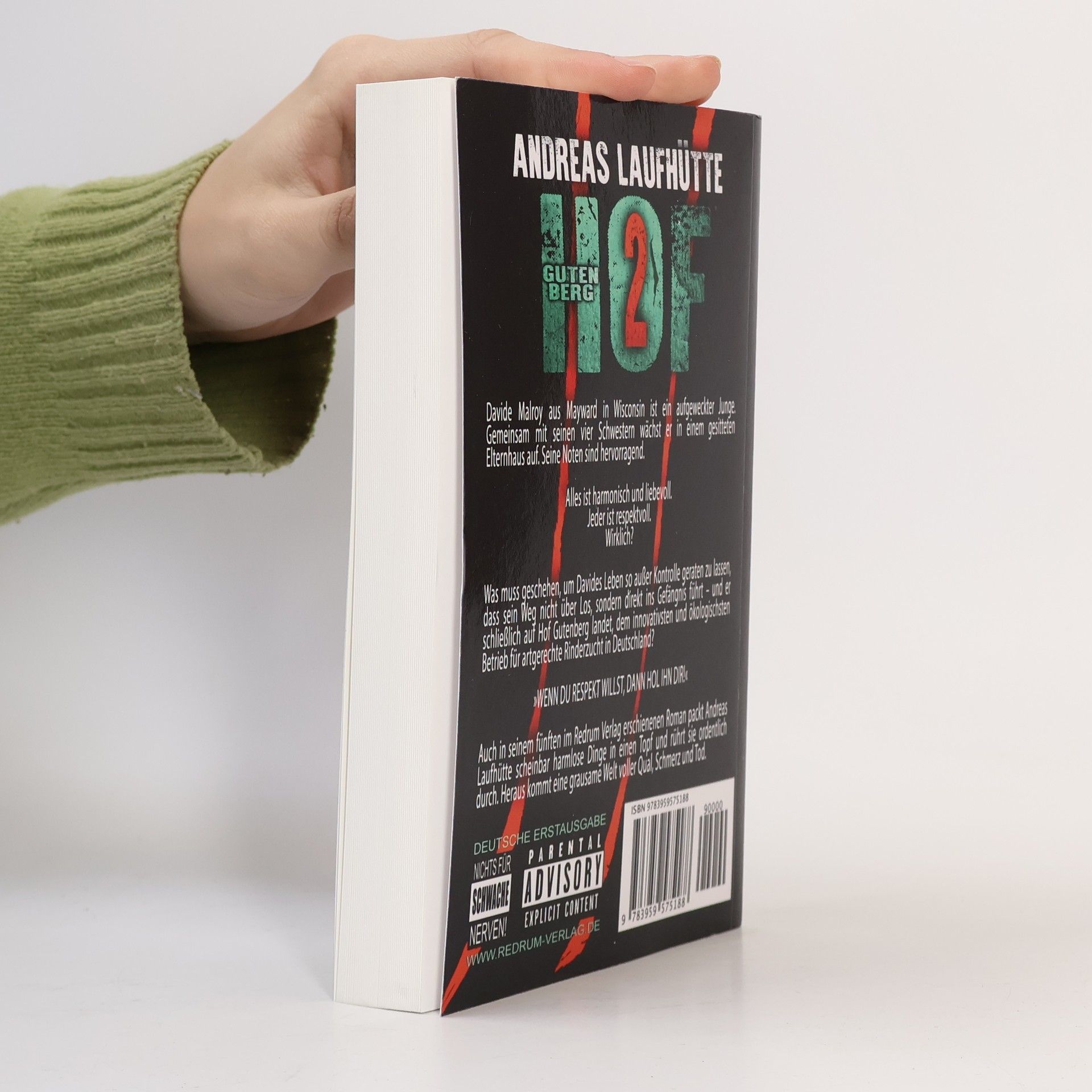 Davide Malroy aus Mayward in Wisconsin ist ein aufgeweckter Junge. Gemeinsam mit seinen vier Schwestern wächst er in einem gesitteten Elternhaus auf. Seine Noten sind hervorragend. Alle Bücher von Andreas Laufhütte können unabhängig voneinander gelesen werden.Alles ist harmonisch und liebevoll.Jeder ist respektvoll.Wirklich?Was muss geschehen, um Davides Leben so außer Kontrolle geraten zu lassen, dass sein Weg nicht über Los, sondern direkt ins Gefängnis führt – und er schließlich auf Hof Gutenberg landet, dem innovativsten und ökologischsten Betrieb für artgerechte Rinderzucht in Deutschland?»WENN DU RESPEKT WILLST, DANN HOL IHN DIR!«Auch in seinem fünften im Redrum Verlag erschienenen Roman packt Andreas Laufhütte scheinbar harmlose Dinge in einen Topf und rührt sie ordentlich durch. Heraus kommt eine grausame Welt voller Qual, Schmerz und Tod.Bisher bei Redrum Books ist Emily?Hof GutenbergDOGSDas Vermächtnis des Jeremiah CrossHof Gutenberg 2