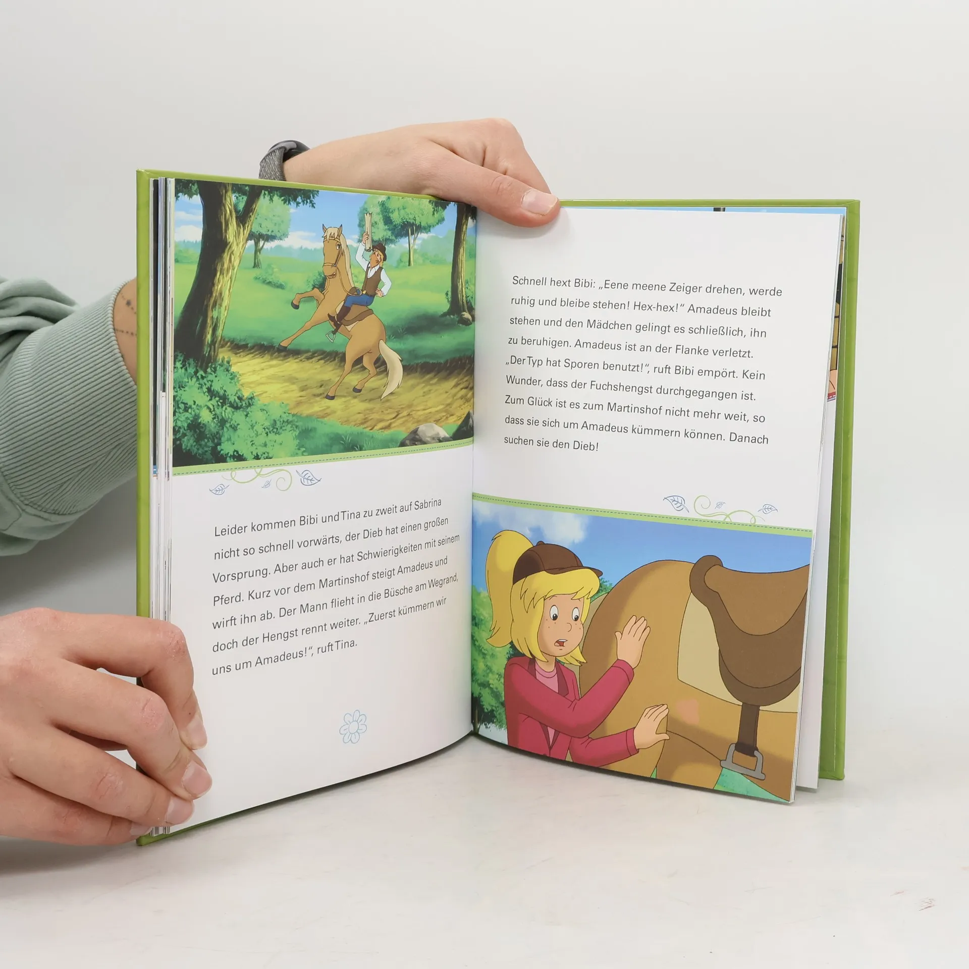 Bibi und Tina sind beste Freundinnen und verbringen ihre Zeit am liebsten auf dem Rücken ihrer Pferde Amadeus und Sabrina. Gemeinsam mit Tinas Freund Alex und seinem Hengst Maharadscha erleben sie viele spannende Abenteuer rund um den Martinshof. In diesem Buch gehst du mit den Freunden auf Zeitreise, besuchst ein Filmset, hilfst Graf von Falkenstein aus der Patsche, klärst einen Pferdediebstahl auf und lernst Westernreiten. antolin