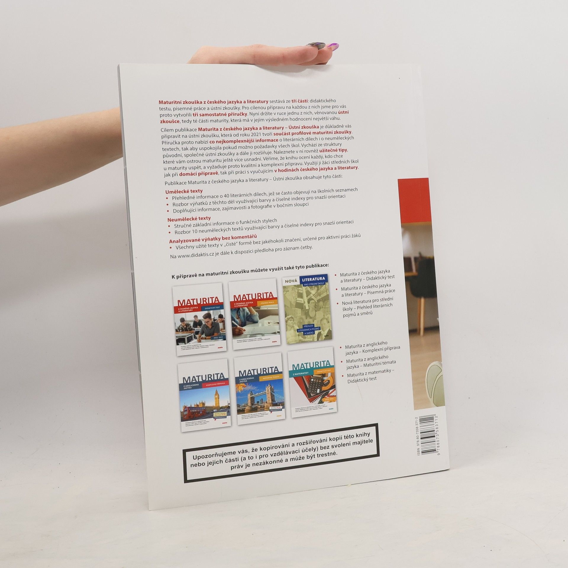 Nová příručka zaměřená na ústní část maturitní zkoušky z českého jazyka a literatury je určena zejména žákům 4. ročníků středoškolských oborů zakončených maturitní zkouškou. Je možné s ní pracovat také průběžně od 1. ročníku. Lze ji využít k samostudiu i ke společné práci s vyučujícím v hodině.