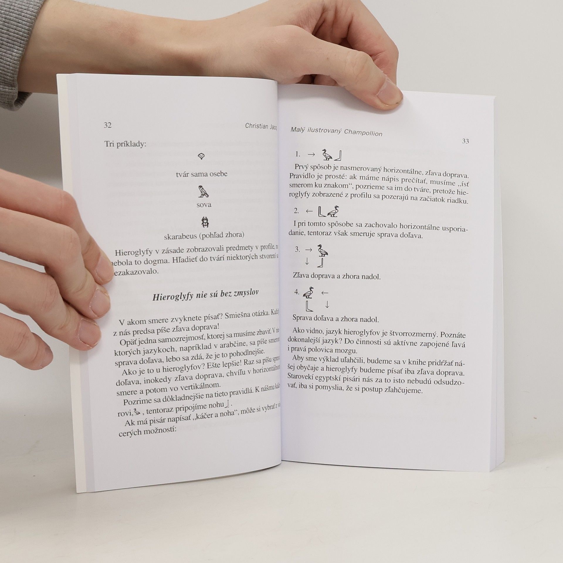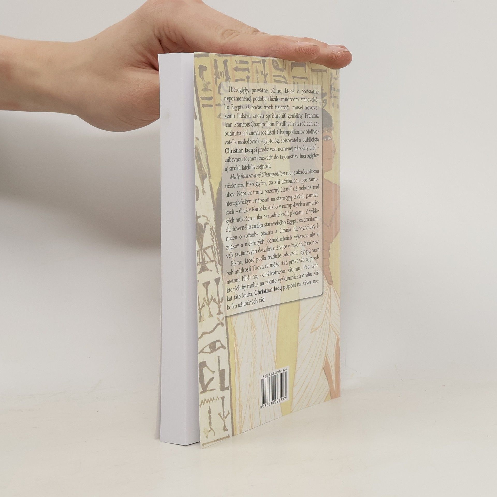 Le petit Champollion illustré Hieroglyfy pre každého, alebo ako sa hravo stať pisárom-amatérom Posvätné písmo, ktoré v podstatne nezmenenej podobe používali mudrci starovekého Egypta počas troch tisícročí znovu sprístupnil geniálny Francúz Jean-Francois Champollion. Jeho obdivovateľ a nasledovník, egyptológ Christian Jacq zábavnou formou zasvätuje do tajomstiev hieroglyfov aj širokú laickú verejnosť. Táto kniha nie je učebnicou, avšak pozornému čitateľovi umožní porozumieť hieroglyfickým nápisom na staroegyptských pamiatkach.