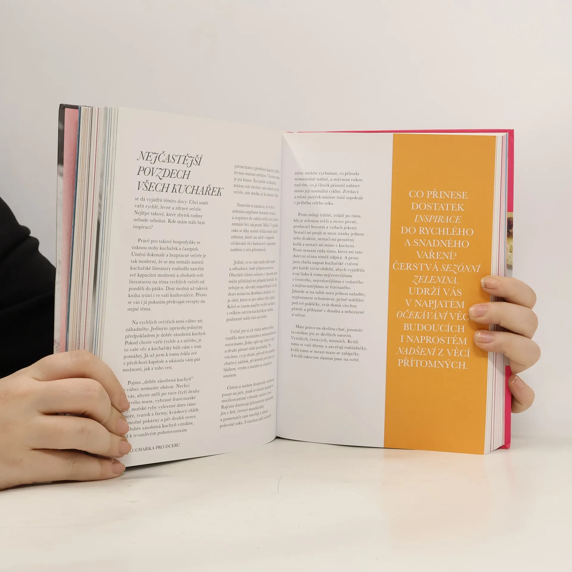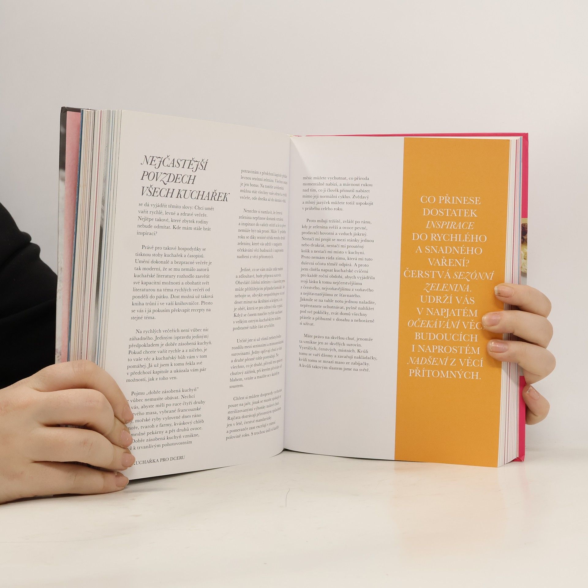 155 vyzkoušených receptů, jak uspět hned napoprvé. Jak se naučit vařit dobře a s chutí? Jak překonat nástrahy složitějších jídel a dosáhnout dokonalosti? Tohle všechno vás Kuchařka pro dceru naučí tak, jak by vás to naučila vaše matka, kdyby na to měla čas. Tahle knížka je jiná než ostatní kuchařky pro začátečníky, je psaná vtipně a s láskou. Nepřikazuje, nehemží se nejasnými pojmy, nezdráhá se přesně vysvětlovat, co se děje v hrnci, a ochotně upozorní na časté chyby. Naučí vás o vaření přemýšlet, vezme vás kamarádsky za ruku a pomůže odhalit kuchařská tajemství. Díky ní uvaříte dokonalé jídlo hned napoprvé. Zvládnete s ní vše, co budete potřebovat – od špaget po svíčkovou. Je to jediná kuchařka na trhu, kterou se můžete provařit od začátku až do konce, jeden recept za druhým, a v mezičase ji číst jako napínavou kuchařskou detektivku.
