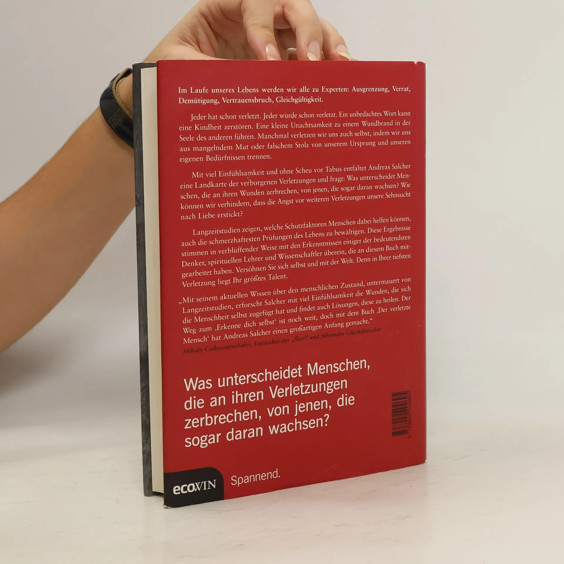 Im Laufe unseres Lebens werden wir alle zu Ausgrenzung, Verrat, Demütigung, Vertrauensbruch, Gleichgültigkeit. Jeder hat schon verletzt. Jeder wurde schon verletzt. Ein unbedachtes Wort kann eine Kindheit zerstören. Eine kleine Unachtsamkeit zu einem Wundbrand in der Seele des anderen führen. Manchmal verletzen wir uns auch selbst, indem wir uns aus mangelndem Mut oder falschem Stolz von unserem Ursprung und unseren eigenen Bedürfnissen trennen. Mit viel Einfühlsamkeit und ohne Scheu vor Tabus entfaltet Andreas Salcher eine Landkarte der verborgenen Verletzungen und Was unterscheidet Menschen, die an ihren Wunden zerbrechen, von jenen, die sogar daran wachsen? Wie können wir verhindern, dass die Angst vor weiteren Verletzungen unsere Sehnsucht nach Liebe erstickt? Langzeitstudien zeigen, welche Schutzfaktoren Menschen dabei helfen können, auch die schmerzhaftesten Prüfungen des Lebens zu bewältigen. Diese Ergebnisse stimmen in verblüffender Weise mit den Erkenntnissen einiger der bedeutendsten Denker, spirituellen Lehrer und Wissenschaftler überein, die an diesem Buch mitgearbeitet haben. Versöhnen Sie sich selbst und mit der Welt. Denn in Ihrer tiefsten Verletzung liegt Ihr größtes Talent.