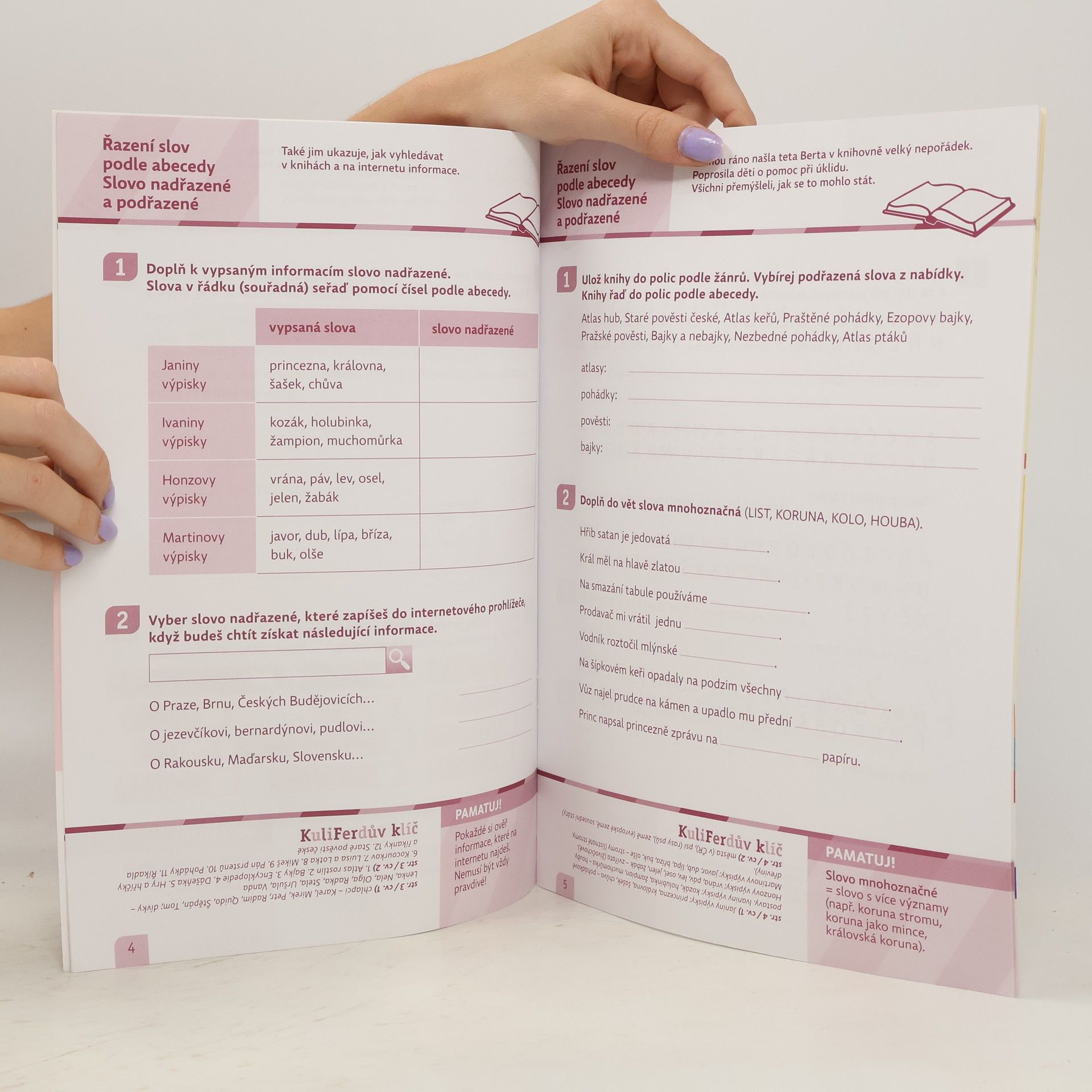 Jednotlivá cvičení v pracovním sešitě propojuje téma knihovny – děti pomáhají paní knihovnici, a díky tomu poznávají její práci. Hledají souvislosti mezi získanými informacemi, a propojují tak své znalosti s jejich praktickým využitím. Používají znalosti o abecedě k řazení názvů knih, opakují si učivo o vlastních jménech, slovech nadřazených a podřazených, slovech jednoznačných a mnohoznačných, synonymech a antonymech. Pracovní sešit je součástí sady 6 pracovních sešitů určených všem školákům 2. a 3. ročníku k procvičování učiva českého jazyka. Pracovní sešity rozvíjí zajímavou a motivační formou základní dovednosti, které jsou důležité pro úspěšné zvládnutí vzdělávací oblasti Jazyk a jazyková komunikace. Dítě díky nim procvičuje jednotlivé jazykové jevy a pravidla, ale především rozvíjí svoji schopnost porozumět textu, přemýšlet o něm a přečtené vnímat v souvislostech s reálným životem. Všechny aktivity tak vhodně navazují na školní vzdělávání podle RVP ZV s důrazem na rozvoj komunikačních kompetencí. Pracovní sešity nabízejí optimální objem aktivit a díky dosažitelnosti úspěšného zvládnutí úkolů podporují pozitivní motivaci dítěte. Každý pracovní sešit je sestaven tak, aby s ním dítě mohlo pracovat samostatně – rodič by měl motivovat, být oporou, povzbuzovat! Pracovní sešity pro Vaše děti připravili zkušení učitelé a učitelky s dlouholetou praxí práce ve škole.