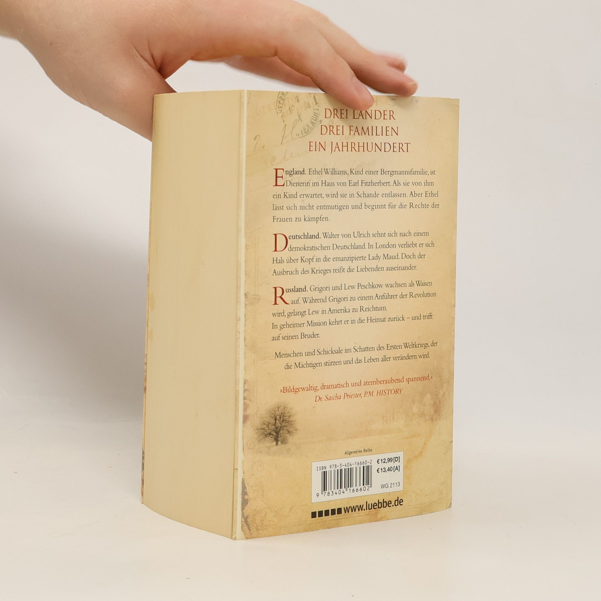 DREI LÄNDER. DREI FAMILIEN. EIN JAHRHUNDERT. Die große Familiensaga von Ken Follett, Autor der Bestseller DIE SÄULEN DER ERDE und DIE TORE DER WELT. Im Jahr 1914 herrscht in Europa Frieden, doch die Weltmächte rüsten zum Krieg. Der drohende Konflikt beeinflusst das Leben mehrerer Familien aus verschiedenen Ländern, deren Wege sich über ein ganzes Jahrhundert kreuzen. Ethel Williams, Tochter einer Bergmannsfamilie aus Wales, wird als Dienerin im Haus von Earl Fitzherbert schwanger und entlassen. Unbeirrt kämpft sie für die Rechte der Frauen, während die Männer in den Krieg ziehen. Walter von Ulrich, aus einer Adelsfamilie, wünscht sich ein demokratisches Deutschland und heiratet heimlich die emanzipierte Lady Maud, kurz bevor der Krieg ausbricht. Doch der Konflikt trennt die Liebenden. Grigori und Lew Peschkow wachsen als Waisen in St. Petersburg auf. Während der rechtschaffene Grigori zum Revolutionär wird, erlangt der leichtfertige Lew in Amerika Reichtum. Als Lew zur Armee eingezogen wird und als Soldat zurückkehrt, trifft er auf seinen Bruder. Als abgeschlossener historischer Roman ist dies der spannende Auftakt von Folletts Jahrhundert-Trilogie, die mit WINTER DER WELT fortgesetzt wird und mit KINDER DER FREIHEIT endet. Platz 1 der SPIEGEL-Bestsellerliste. „Bildgewaltig, dramatisch und atemberaubend spannend.“ Dr. Sascha Priester, P. M. History. Mit einer Leseprobe aus WINTER DER WELT.