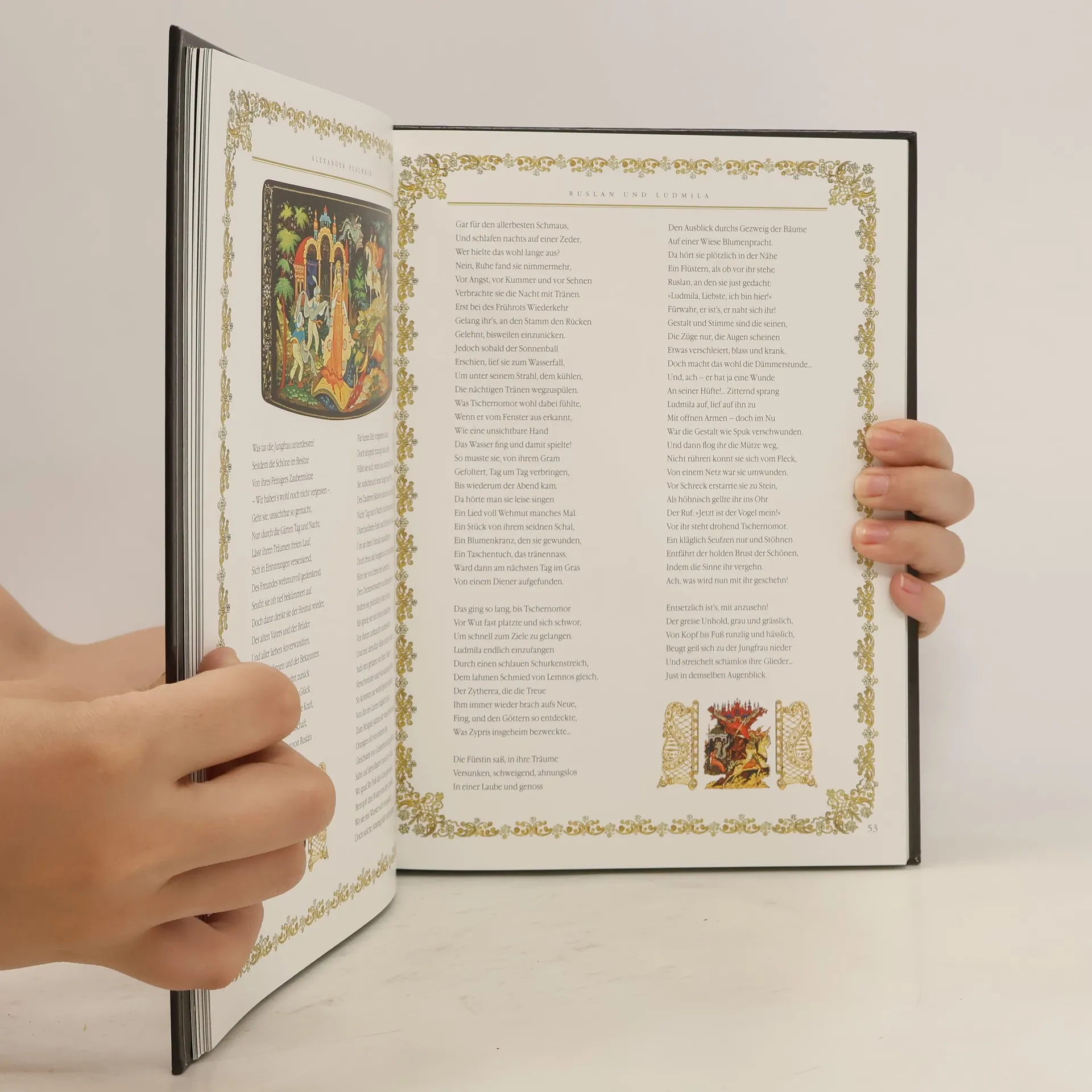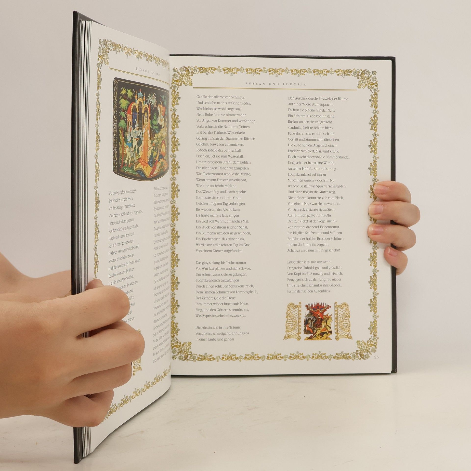 Alexander Puschkin (1799-1837) ist ein genialer Dichter und Prosaiker. Er schuf die moderne russische Literatursprache und ist Russlands Stolz sein Symbol die Verkörperung des russischen Geistes. Unter dem unsterblichen Erbe unseres großen Landsmannes nehmen seine wahrhaft nationalen auf der russischen Folklore basierenden Märchenverse eine wichtige Stellung ein. Die Künstler von Palech diesem berühmten altehrwürdigen Zentrum der Ikonenmalerei und Lackminiatur wenden sich oft den Märchen Puschkins zu.
