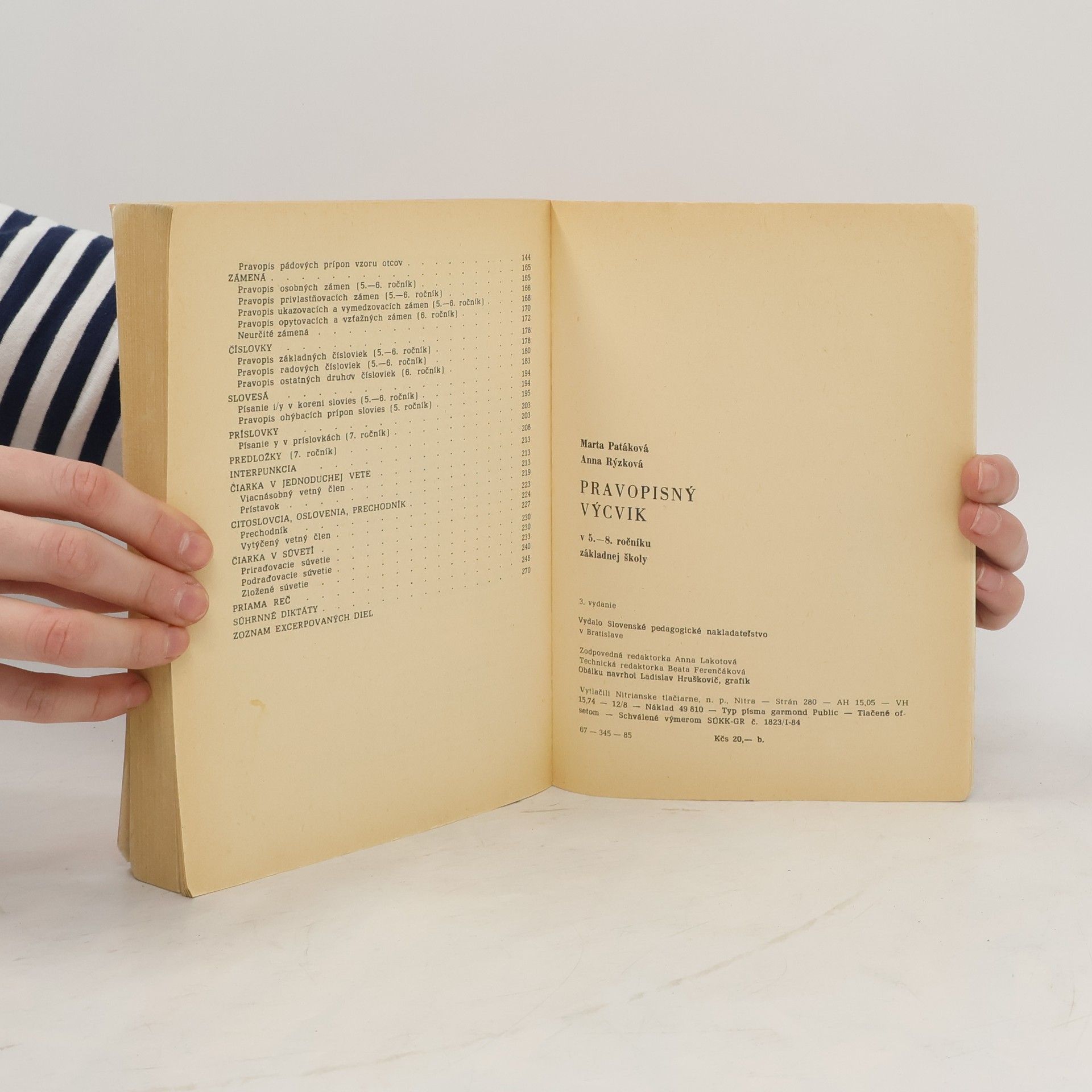 Obsah: Hláskovanie, Pravopis slov cudzieho pôvodu, Kvantita samohlások, Rytmické krátenie, Pravopis, Zhŕňajúce diktáty na písanie ií, yý v koreni slova, Tvorenie slov, Tvaroslovie, Pravopis ohýbacích prípon, Prídavné mená, Zámená, Číslovky, Slovesá, Príslovky, Predložky, Interpunkcia, Čiarka v jednoduchej vete, Citoslovcia, Oslovenia, Prechodník, Čiarka v súvetí, Priama reč, Súhrnné diktáty, Zoznam excerpovaných diel. Tretie vydanie. 67-345-85