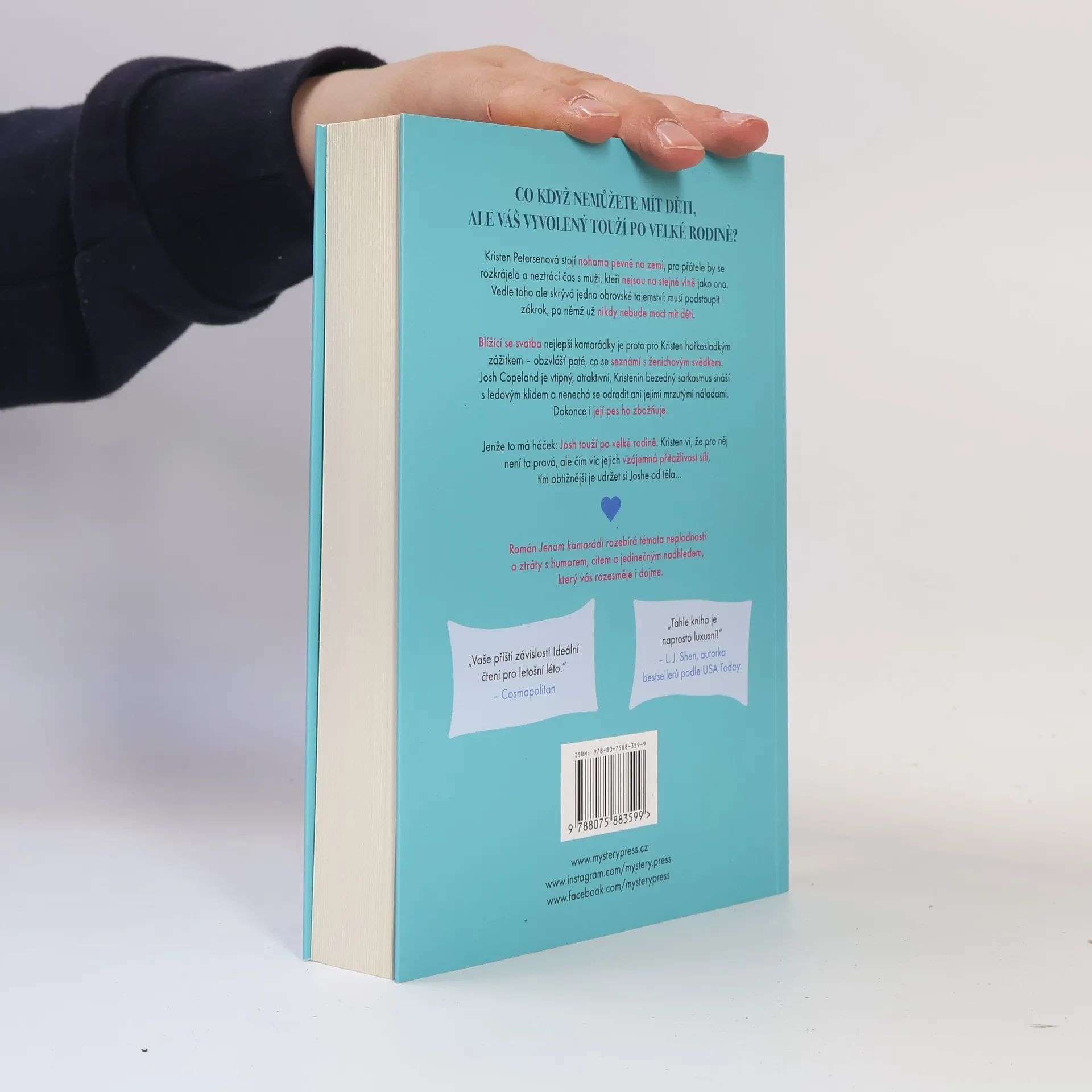 CO KDYŽ NEMŮŽETE MÍT DĚTI, ALE VÁŠ VYVOLENÝ TOUŽÍ PO VELKÉ RODINĚ? Kristen Petersenová stojí nohama pevně na zemi, pro přátele by se rozkrájela a neztrácí čas s muži, kteří nejsou na stejné vlně jako ona. Vedle toho ale skrývá jedno obrovské tajemství: musí podstoupit zákrok, po němž už nikdy nebude moct mít děti. Blížící se svatba nejlepší kamarádky je proto pro Kristen hořkosladkým zážitkem – obzvlášť poté, co se seznámí s ženichovým svědkem. Josh Copeland je vtipný, atraktivní, Kristenin bezedný sarkasmus snáší s ledovým klidem a nenechá se odradit ani jejími mrzutými náladami. Dokonce i její pes ho zbožňuje. Jenže to má háček: Josh touží po velké rodině. Kristen ví, že pro něj není ta pravá, ale čím víc jejich vzájemná přitažlivost sílí, tím obtížnější je udržet si Joshe od těla…