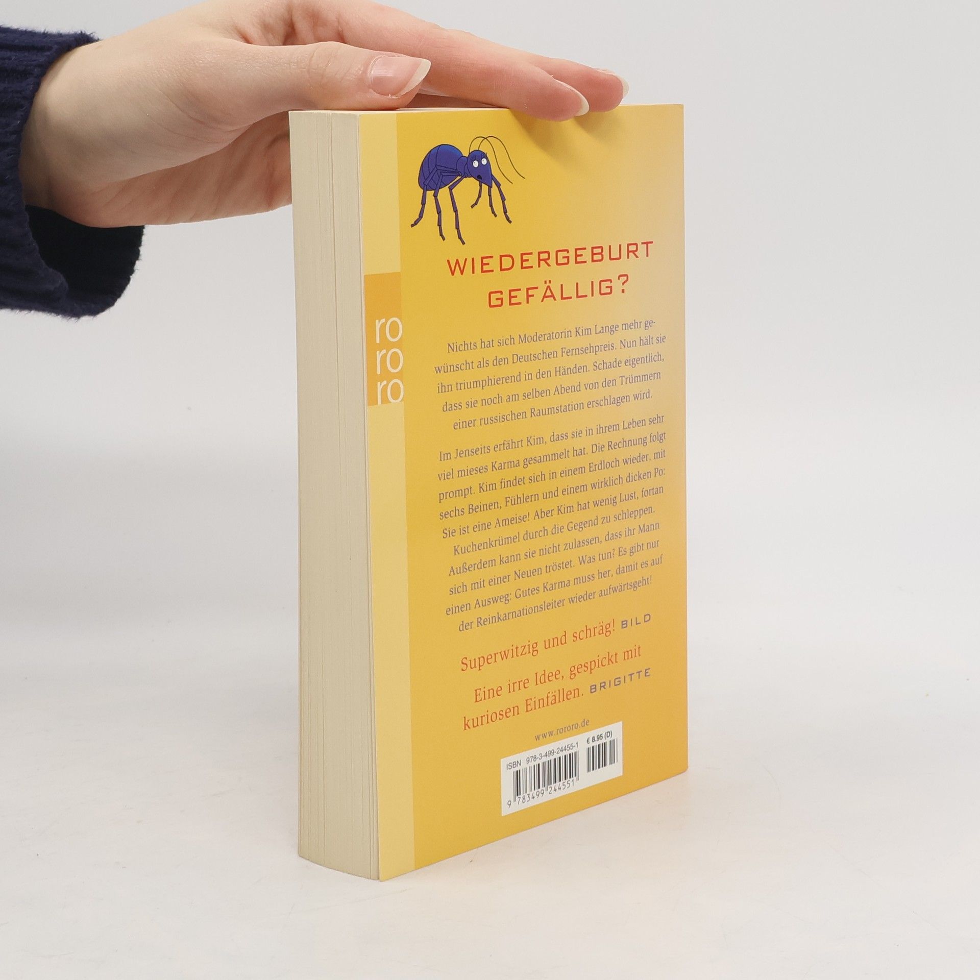 Wiedergeburt gefällig? Nichts hat sich Moderatorin Kim Lange mehr gewünscht als den deutschen Fernsehpreis. Nun hält sie ihn triumphierend in den Händen. Schade eigentlich, dass sie noch am selben Abend von den Trümmern einer russischen Raumstation erschlagen wird.Im Jenseits erfährt Kim, dass sie in ihrem Leben sehr viel mieses Karma gesammelt hat. Die Rechnung folgt prompt. Kim findet sich in einem Erdloch wieder, mit sechs Beinen, Fühlern und einem wirklich dicken Po: Sie ist eine Ameise! Aber Kim hat wenig Lust, fortan Kuchenkrümel durch die Gegend zu schleppen. Außerdem kann sie nicht zulassen, dass ihr Mann sich mit einer Neuen tröstet. Was tun? Es gibt nur einen Ausweg: Gutes Karma muss her, damit es auf der Reinkarnationsleiter wieder aufwärts geht! «Superwitzig und schräg!» (Bild) «Eine irre Idee, gespickt mit kuriosen Einfällen.» (Brigitte)