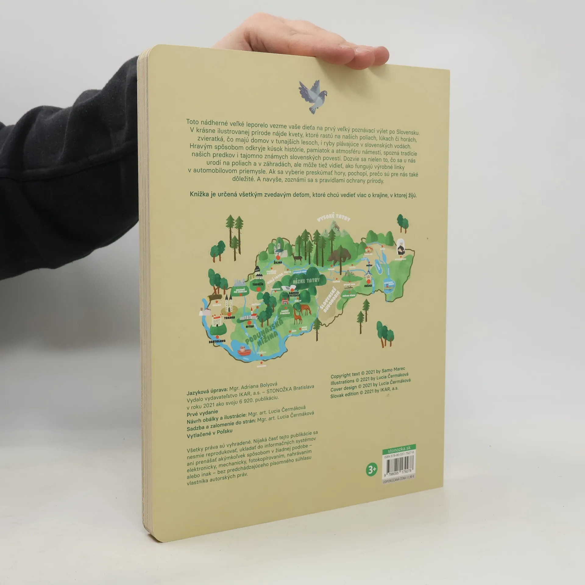 Toto nádherné veľké leporelo vezme vaše dieťa na prvý veľký poznávací výlet po Slovensku. V krásne ilustrovanej prírode nájde kvety, ktoré rastú na našich poliach, lúkach či horách, zvieratká, čo majú domov v tunajších lesoch, i ryby plávajúce v slovenských vodách. Hravým spôsobom odkryje kúsok histórie, pamiatok a atmosféru námestí, spozná tradície našich predkov i tajomno známych slovenských povestí. Dozvie sa nielen to, čo sa u nás urodí na poliach a záhradách, ale môže tiež vidieť, ako fungujú výrobné linky v automobilovom priemysle. Ak sa vyberie preskúmať hory, pochopí, prečo sú pre nás také dôležité. A navyše, zoznámi sa s pravidlami ochrany prírody. Knižka je určená všetkým zvedavým deťom, ktoré chcú vedieť viac o krajine, v ktorej žijú. Pre deti od 3 rokov