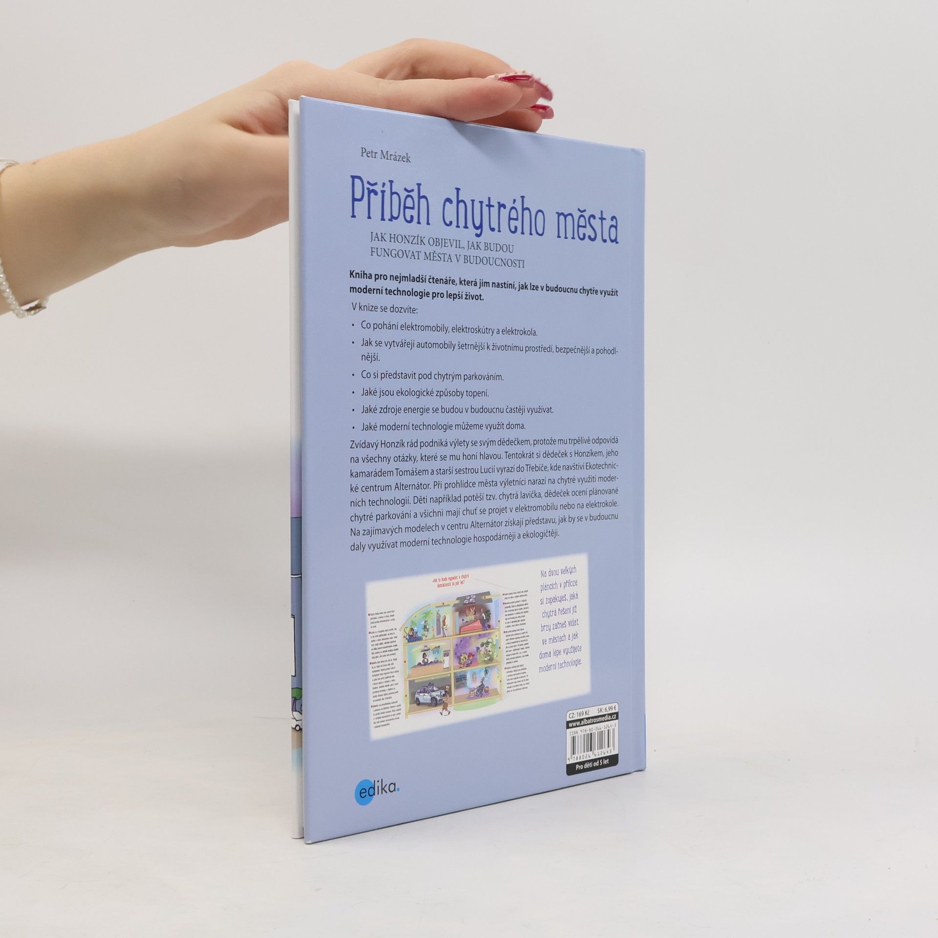 Jak Honzík objevil, jak budou fungovat města v budoucnosti. Kniha pro nejmladší čtenáře, která jim nastíní, jak lze v budoucnu chytře využít moderní technologie pro lepší život. V knize se dozvíte: • Co pohání elektromobily, elektroskútry a elektrokola. • Jak se vytvářejí automobily šetrnější k životnímu prostředí, bezpečnější a pohodlnější. • Co si představit pod chytrým parkováním. • Jaké jsou ekologické způsoby topení. • Jaké zdroje energie se budou v budoucnu častěji využívat. • Jaké moderní technologie můžeme využít doma. Zvídavý Honzík rád podniká výlety se svým dědečkem, protože mu trpělivě odpovídá na všechny otázky, které se mu honí hlavou. Tentokrát si dědeček s Honzíkem, jeho kamarádem Tomášem a starší sestrou Lucií vyrazí do Třebíče, kde navštíví ekotechnické centrum Alternátor. Při prohlídce města výletníci narazí na chytré využití moderních technologií. Děti například potěší tzv. chytrá lavička, dědeček ocení plánované chytré parkování a všichni mají chuť se projet v elektromobilu nebo na elektrokole. Na zajímavých modelech v centru Alternátor získají představu, jak by se v budoucnu daly využívat moderní technologie hospodárněji a ekologičtěji. Na dvou velkých pláncích v příloze si zopakuješ, jaká chytrá řešení již brzy začneš vídat ve městech a jak doma lépe využijete moderní technologie.