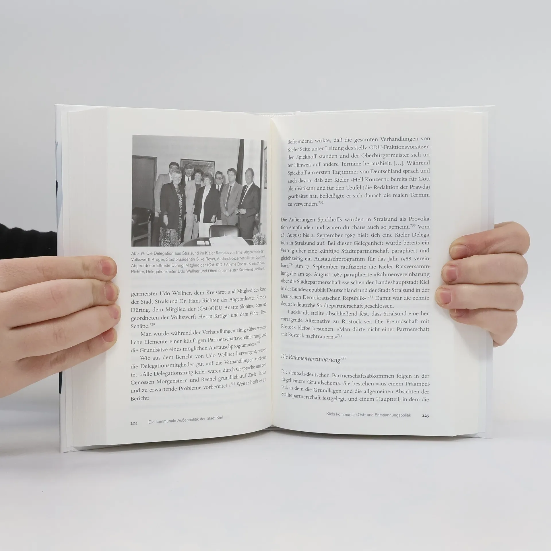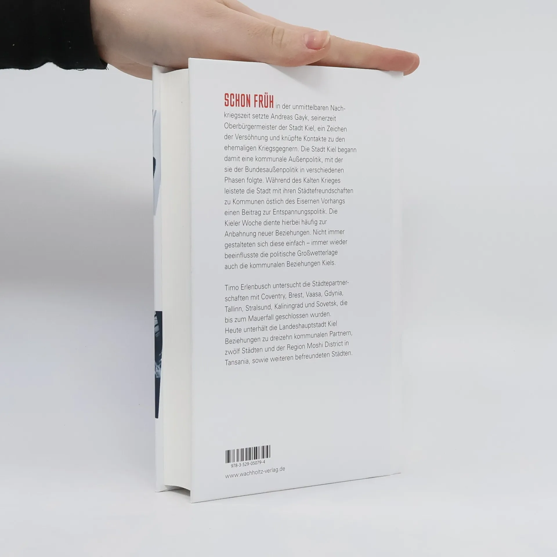 Schon früh in der unmittelbaren Nachkriegszeit setzte Andreas Gayk, seinerzeit Oberbürgermeister der Stadt Kiel, ein Zeichen der Versöhnung und knüpfte Kontakte zu den ehemaligen Kriegsgegnern. Die Stadt Kiel begann damit eine kommunale Außenpolitik, mit der sie der Bundesaußenpolitik in verschiedenen Phasen folgte. Während des Kalten Krieges leistete die Stadt mit ihren Städtefreundschaften zu Kommunen östlich des Eisernen Vorhangs einen Beitrag zur Entspannungspolitik. Die Kieler Woche diente hierbei häufig zur Anbahnung neuer Beziehungen. Nicht immer gestalteten sich diese einfach – immer wieder beeinflusste die politische Großwetterlage auch die kommunalen Beziehungen Kiels. Timo Erlenbusch untersucht die Städtepartnerschaften mit Coventry, Brest, Vaasa, Gdynia, Tallinn, Stralsund, Kaliningrad und Sovetsk, die bis zum Mauerfall geschlossen wurden. Heute unterhält die Landeshauptstadt Kiel Beziehungen zu dreizehn kommunalen Partnern, zwölf Städten und der Region Moshi District in Tansania, sowie weiteren befreundeten Städten.