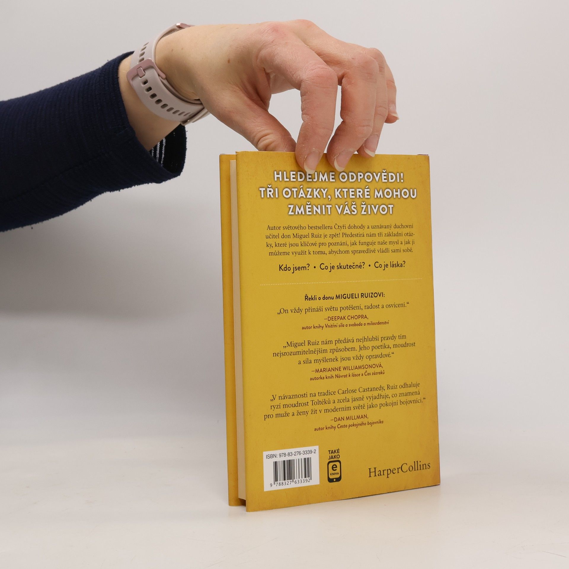 Hledejme odpovědi. Tři otázky, které mohou změnit váš život. • Kdo jsem? • Co je skutečné? • Co je láska? Autor světového bestselleru Čtyři dohody a uznávaný duchovní učitel don Miguel Ruiz nám předkládá tři základní otázky, které jsou klíčové pro poznání, jak funguje naše mysl a jak ji můžeme využít k tomu, abychom spravedlivě vládli sami sobě. Prostřednictvím těchto jednoduchých, ale nanejvýš důležitých otázek Miguel Ruiz postupně odkrývá nejrůznější klamy a sebeklamy, jimiž jako jednotlivci i jako lidstvo podléháme a jež jsou permanentním ( a podle všeho zbytečným) zdrojem naší duševní a tělesné nepohody či dokonce až utrpění.