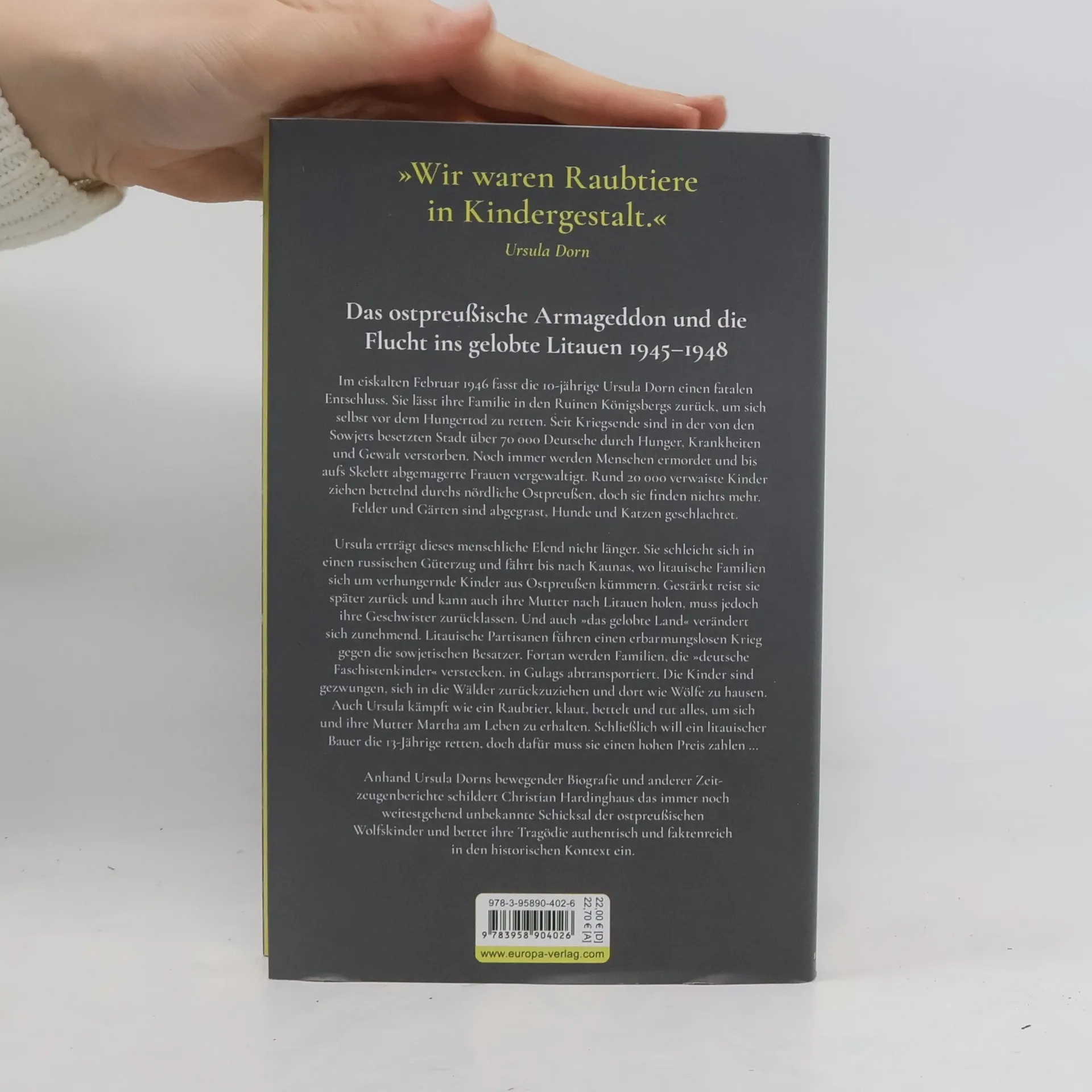 Im Februar 1946 trifft die elfjährige Ursula Dorn einen fatalen Entschluss. Sie lässt ihre Familie in den Ruinen Königsbergs zurück, um sich selbst vor dem Hungertod zu retten. Seit Kriegsende sind in der von den Sowjets besetzten Stadt über 70.000 Deutsche durch Hunger, Krankheiten und Gewalt verstorben, werden bis aufs Skelett abgemagerte Frauen vergewaltigt, erfrorene Säuglinge bleiben in ihren Kinderwagen zurück. Rund 20.000 verwaiste Kinder ziehen bettelnd durchs nördliche Ostpreußen. Ursula erträgt das Elend nicht mehr; sie schleicht sich in einen russischen Güterzug und fährt bis nach Kaunas, wo litauische Familien sich um deutsche Kinder kümmern. Ursula kommt zu Kräften, reist zurück und kann ihre Mutter befreien. Ihre Geschwister allerdings muss sie zurücklassen. Und auch das gelobte Land verändert sich, es tobt ein erbarmungsloser Partisanenkrieg. Fortan werden Familien, die „deutsche Faschistenkinder“ verstecken, in Gulags transportiert. Die Kinder sind gezwungen, sich in die Wälder zurückzuziehen und dort wie Wölfe zu hausen.
