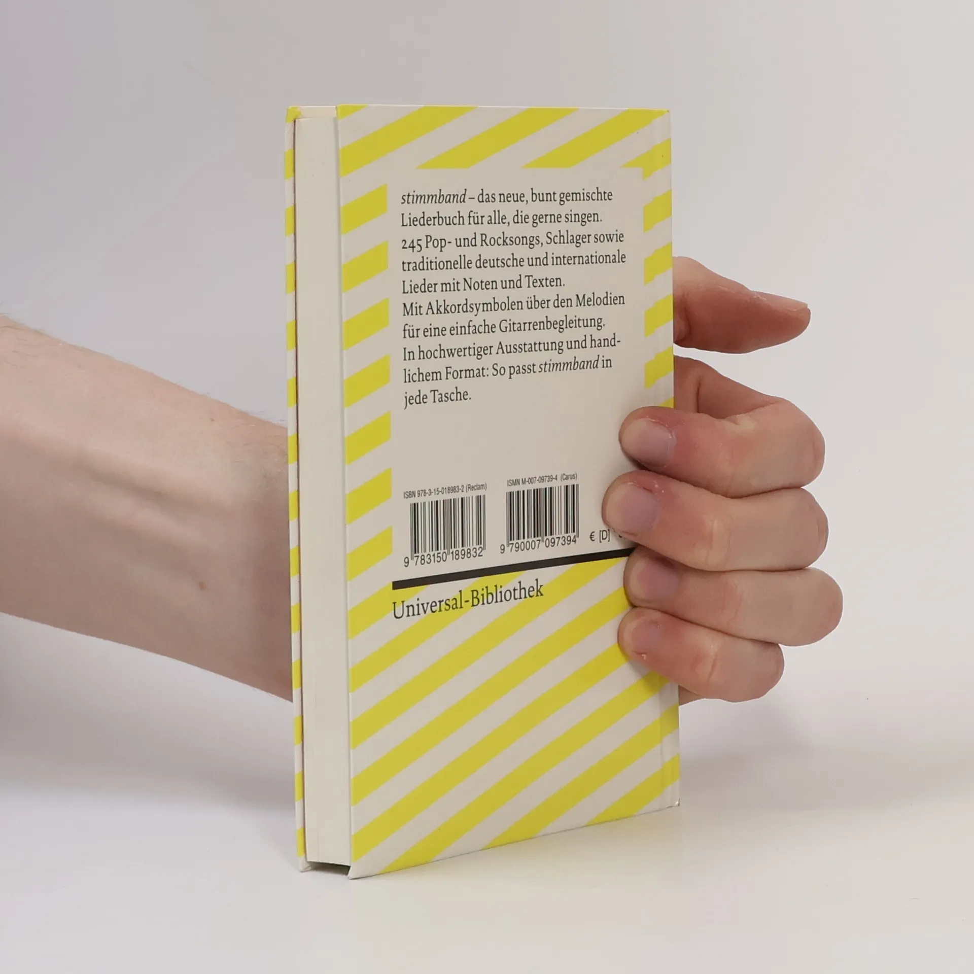 Mancher tut es ja nur in der Badewanne, für die meisten aber ist das Singen ein geselliges Vergnügen: im Kreis von Freunden und Verwandten, in Vereinen und Jugendgruppen. Für alle geselligen Anlässe enthält der stimmband von Carus und Reclam etwa 250 Lieder verschiedener Stilrichtungen. Ausgewählt auf der Basis einer umfangreichen Umfrage in vielen Schulen wurde der Band in enger Kooperation mit der Landesakademie für die musizierende Jugend Ochsenhausen konzipiert und ist auf schulische Belange ausgerichtet. Enthalten sind: Traditionelle deutsche Lieder, Internationale Titel, Songs aus der Welt von Pop, Rock und Schlager, Spirituals, Gospels und geistliche Lieder. Der Band ist durchgehend zweifarbig illustriert. Akkordsymbole über den Melodien ermöglichen eine einfache Gitarrenbegleitung. Der stimmband hat das typische Format der Universal- Bibliothek. Er passt also in jede Tasche. Um seine »outdoor-Funktionalität« weiter zu verbessern, ist dieser Reclam-Band mit einem abwaschbaren Flexicover ausgestattet: Er lässt sich also überall hin mitnehmen und ist auch dann noch einsatzbereit, wenn’s am Lagerfeuer mal regnet. (Und für die Badewanne taugt er auch.)