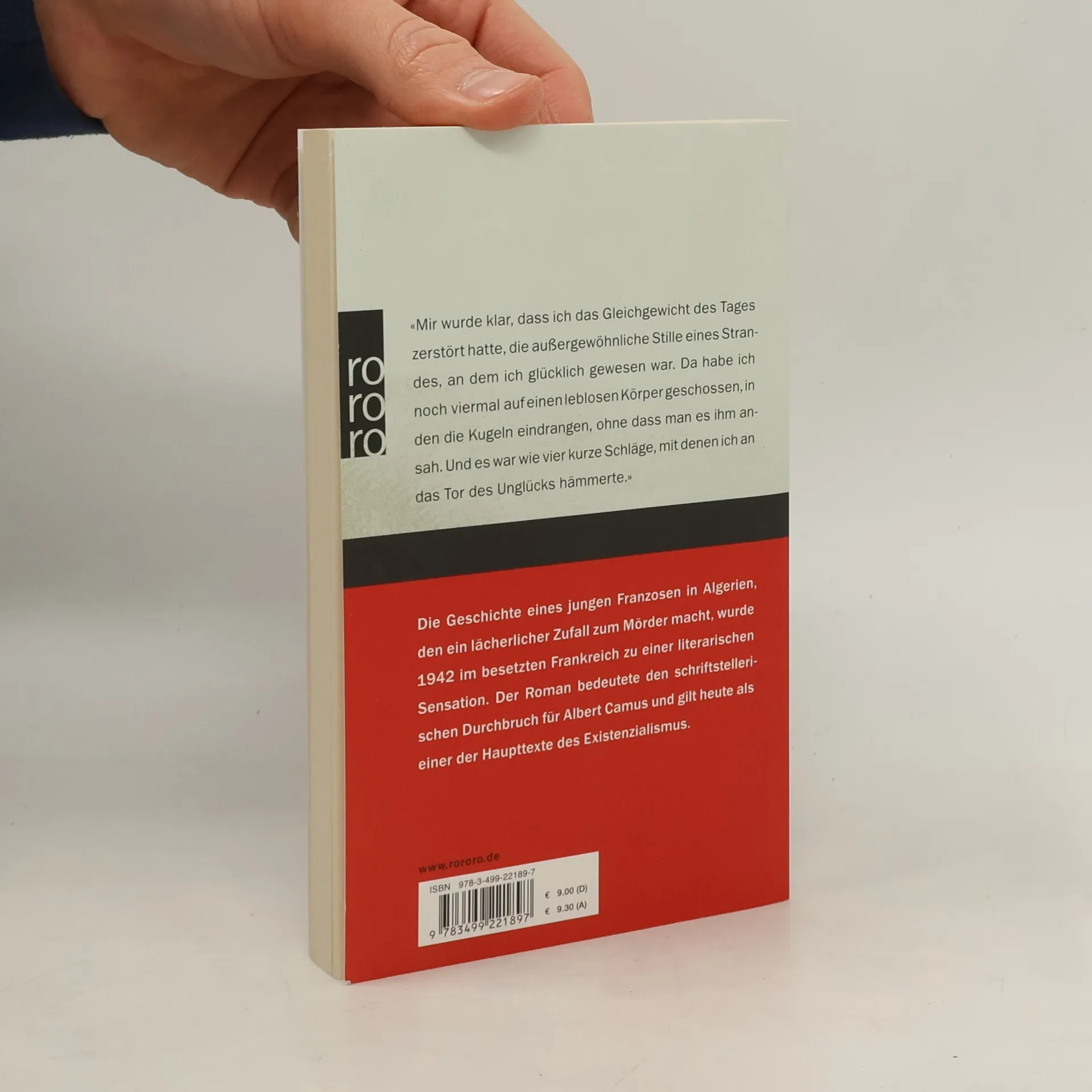«Mir wurde klar, dass ich das Gleichgewicht des Tages zerstört hatte, die außergewöhnliche Stille eines Strandes, an dem ich glücklich gewesen war. Da habe ich noch viermal auf einen leblosen Körper geschossen, in den die Kugeln eindrangen, ohne dass man es ihm ansah. Und es war wie vier kurze Schläge, mit denen ich an das Tor des Unglücks hämmerte.» Die Geschichte eines jungen Franzosen in Algerien, den ein lächerlicher Zufall zum Mörder macht, wurde 1942 im besetzten Frankreich zu einer literarischen Sensation. Der Roman bedeutete den schriftstellerischen Durchbruch für Albert Camus und gilt heute als einer der Haupttexte des Existenzialismus.