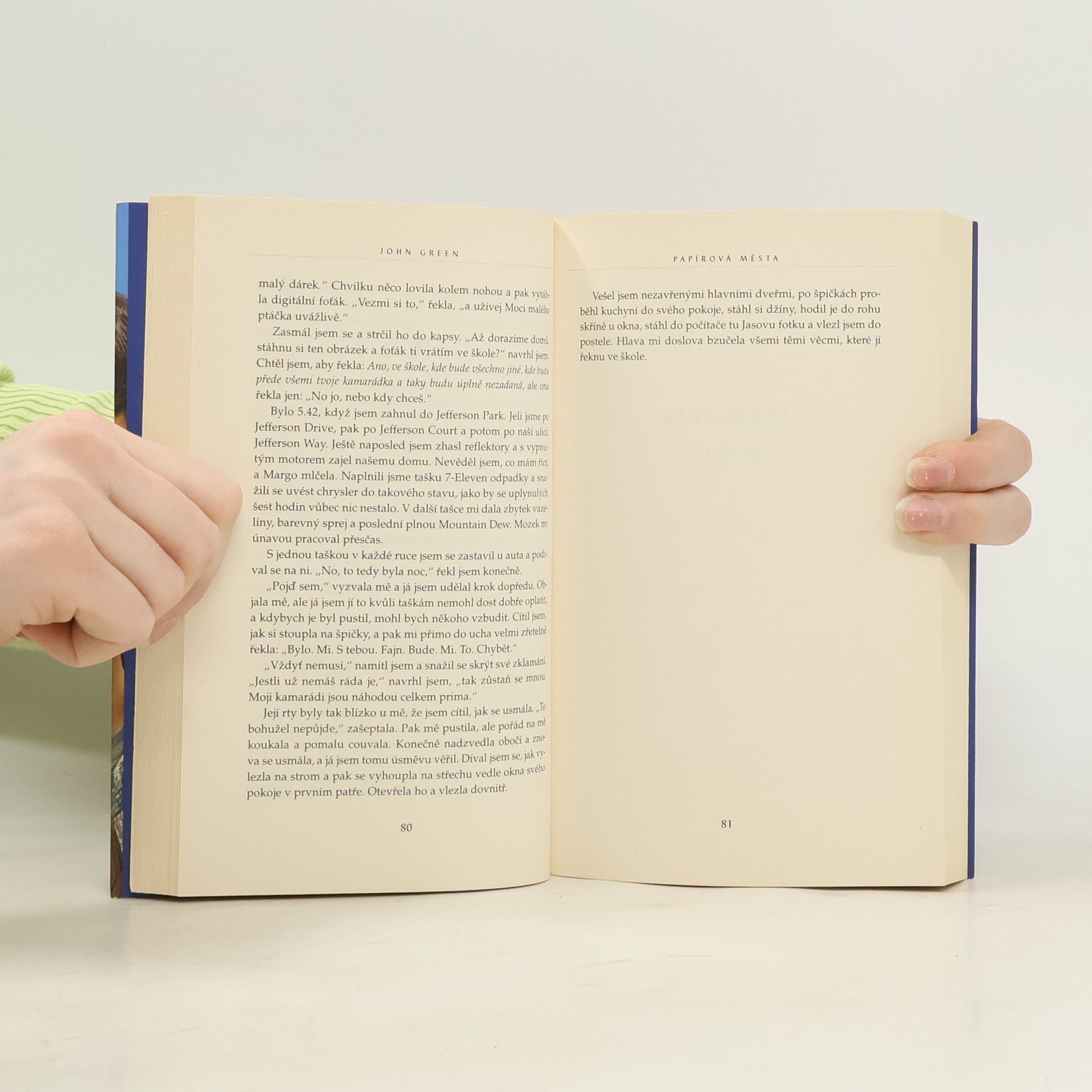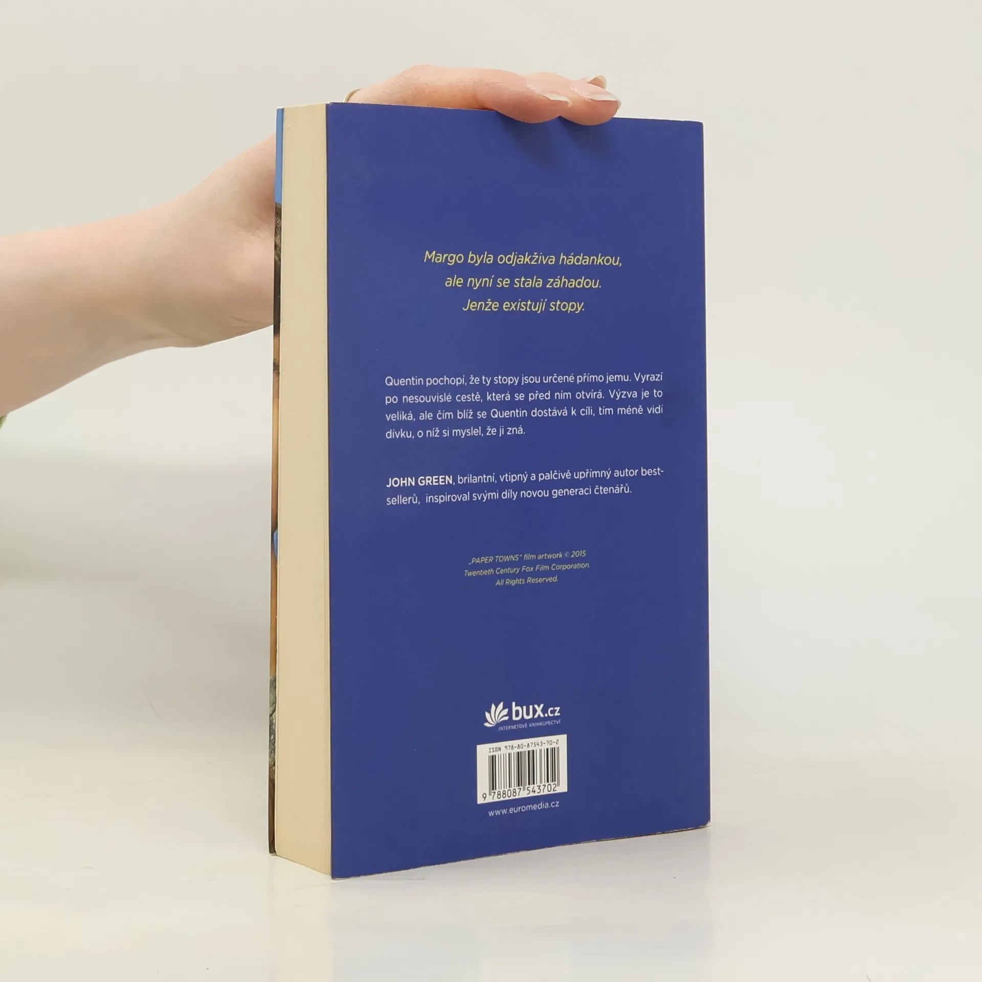 Po úspěchu románů Hvězdy nám nepřály a Hledání Aljašky vychází nyní v českém překladu další dílo veleúspěšného autora Johna Greena, který si i u nás bleskurychle získal početný fanklub. Hrdinou je Quentin Jacobsen, normální, tak trochu bojácný kluk, který má od dětství rád nespoutanou Margo. Ta mu pak jednoho dne nečekaně zaklepe na okno a vtáhne ho do podivuhodného dobrodružství. Když dívka další dny ve škole chybí, Quentin začne pátrat a brzy si uvědomí, že pro něj zanechala určité stopy. Znal vlastně Margo? A co jsou papírová města, s nimiž se nyní stále setkává? Oblíbený autor přináší brilantní příběh nabitý upřímnými emocemi, který nenechá čtenáře chladným.