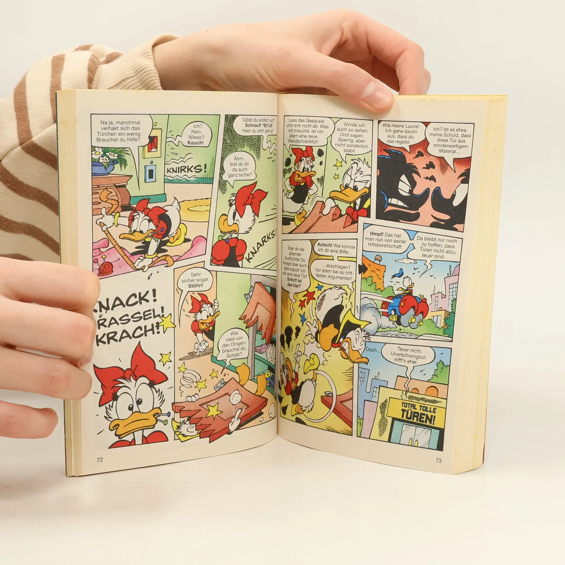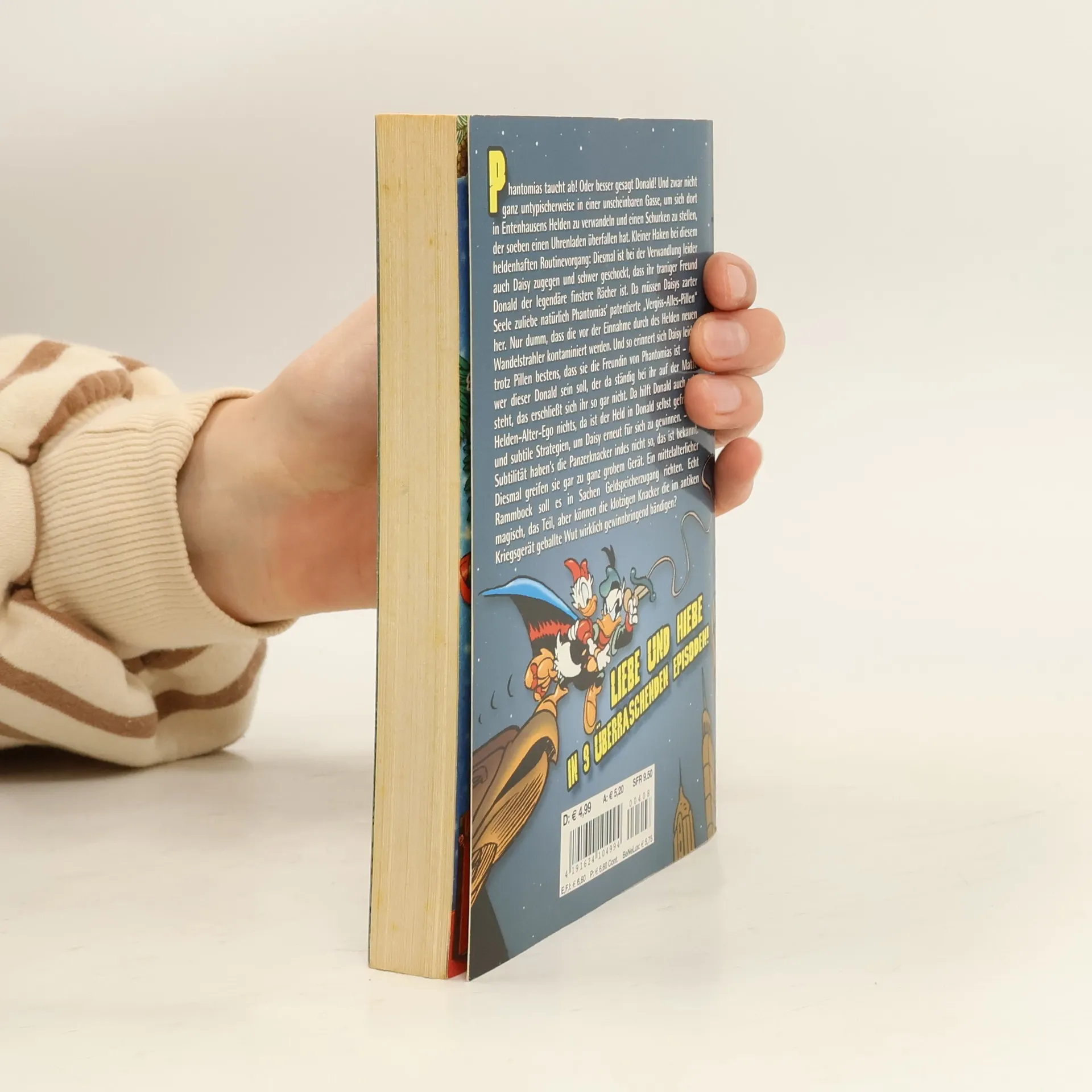 Phantomias taucht ab! Oder besser gesagt Donald! Und zwar nicht ganz untypischerweise in einer unscheinbaren Gasse, um sich dort in Entenhausens Helden zu verwandeln und einen Schurken zu stellen, der soeben einen Uhrenladen überfallen hat. Kleiner Haken bei diesem heldenhaften Routinevorgang: Diesmal ist bei der Verwandlung leider auch Daisy zugegen und schwer geschockt, dass ihr traniger Freund Donald der legendäre finstere Rächer ist. Da müssen Daisys zarter Seele zuliebe natürlich Phantomias’ patentierte „Vergiss-Alles-Pillen“ her. Nur dumm, dass die vor der Einnahme durch des Helden neuen Wandelstrahler kontaminiert werden. Und so erinnert sich Daisy leider trotz Pillen bestens, dass sie die Freundin von Phantomias ist – nur wer dieser Donald sein soll, der da ständig bei ihr auf der Matte steht, das erschließt sich ihr so gar nicht. Da hilft Donald auch sein Helden-Alter-Ego nichts, da ist der Held in Donald selbst gefragt – und subtile Strategien, um Daisy erneut für sich zu gewinnen. – Mit Subtilität haben’s die Panzerknacker indes nicht so, das ist bekannt. Diesmal greifen sie gar zu ganz grobem Gerät. Ein mittelalterlicher Rammbock soll es in Sachen Geldspeicherzugang richten. Echt magisch, das Teil, aber können die klotzigen Knacker die im antiken Kriegsgerät geballte Wut wirklich gewinnbringend bändigen?Liebe und Hiebe in 9 überraschenden Episoden!