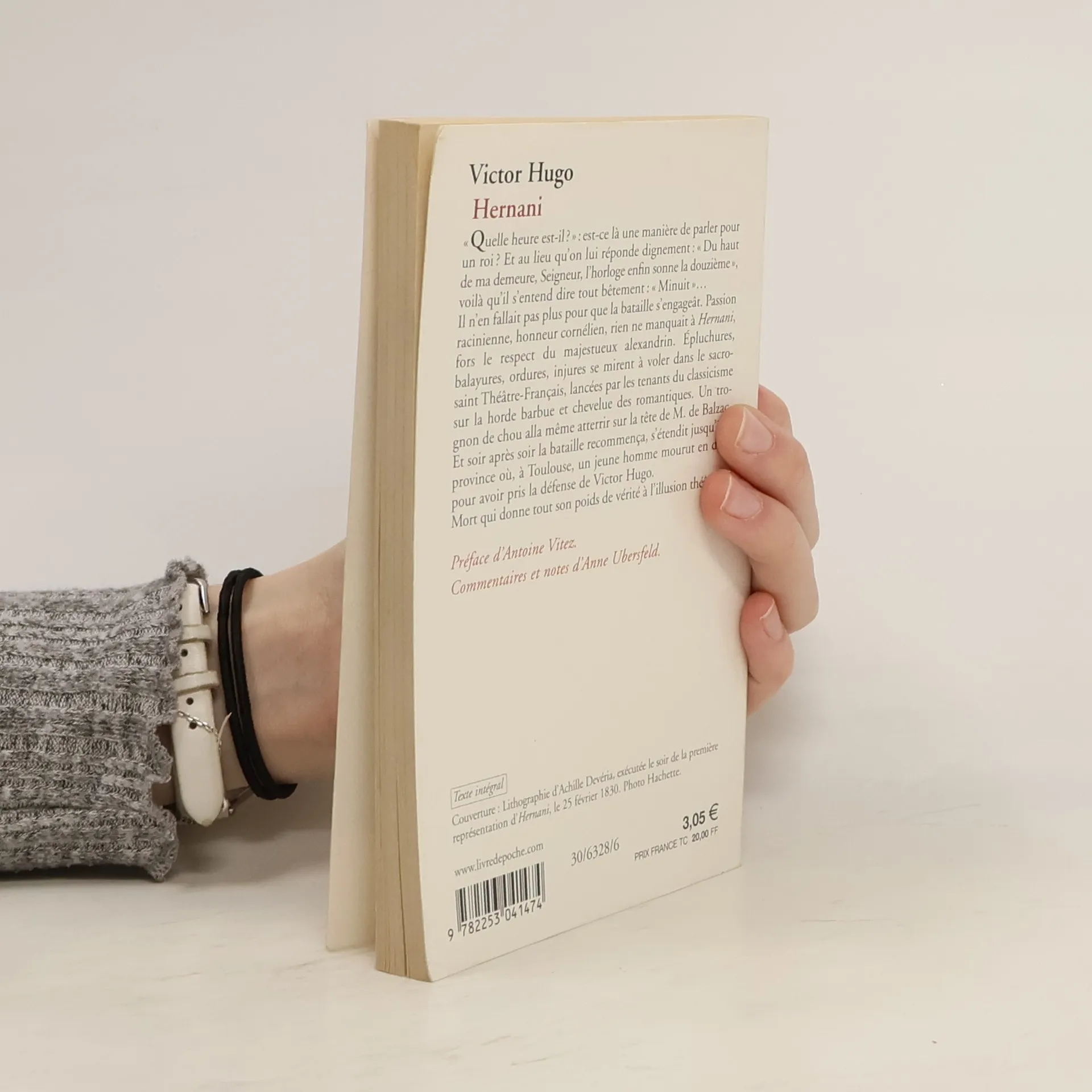 « Quelle heure est-il ? » est-ce là une manière de parler pour un roi ? Et au lieu qu'on lui réponde dignement: « Du haut de ma demeure, Seigneur, l'horloge enfin sonne la douzième », voilà qu'il s'entend dire tout bètement: « Minuit »... Il n'en fallait pas plus pour que la bataille s'engageât. Passion racinienne, honneur cornélien, rien ne manquait à Hernani, fors le respect du majestueux alexandrin. Epluchures, balayures, ordures, injures se mirent à voler dans le sacro-saint Théâtre-Français, lancées par les tenants du classicisme sur la horde barbue et chevelue des romantiques. Un trognon de chou alla mème atterrir sur la tète de M. de Balzac. Et soir après soir la bataille recommença, s'étendit jusqu'à la province où, à Toulouse, un jeune homme mourut en duel pour avoir pris la défense de Victor Hugo. Mort qui donne tout son poids de vérité à l'illusion théâtrale. Préface d'Antoine Vitez. Commentaires et notes d'Anne Ubersfeld.