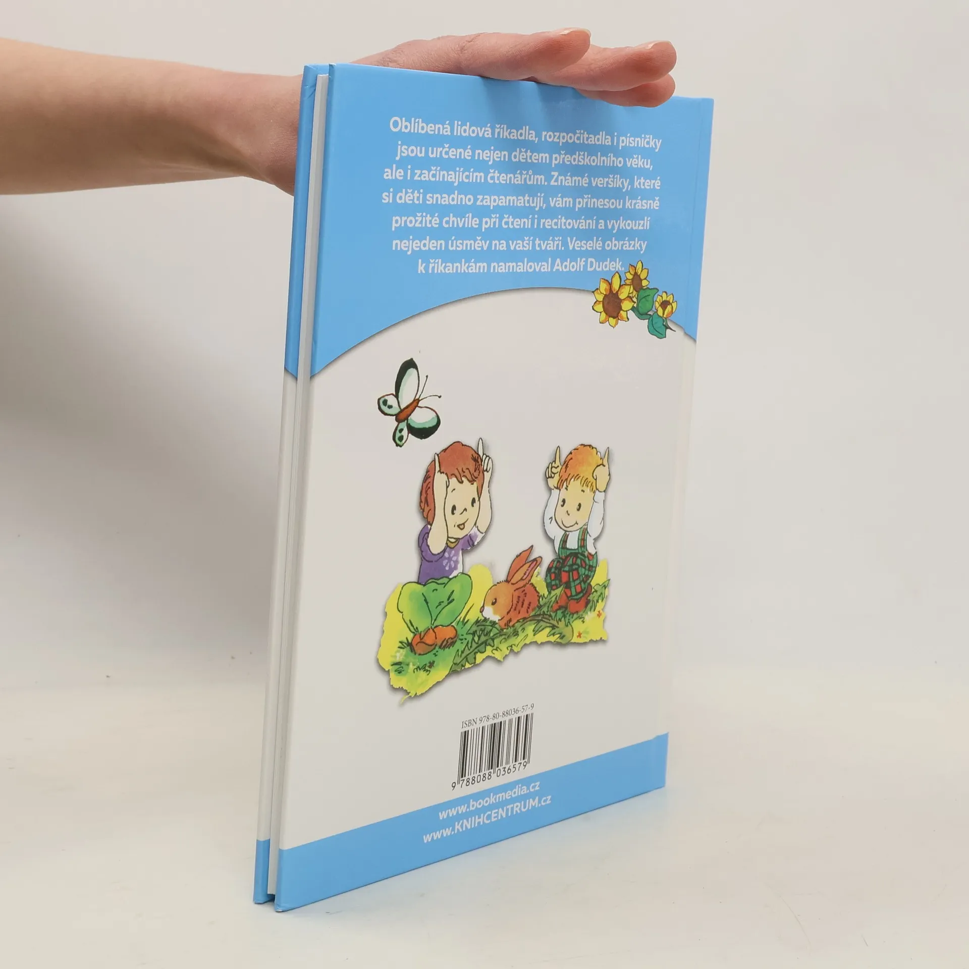 Oblíbená lidová říkadla, rozpočítadla i písničky jsou určené nejen dětem předškolního věku, ale i začínajícím čtenářům. Známé veršíky, které si děti snadno zapamatují, vám přinesou krásně prožité chvíle při čtení i recitování a vykouzlí nejeden úsměv na vaší tváři. Veselé obrázky k říkankám namaloval Adolf Dudek.