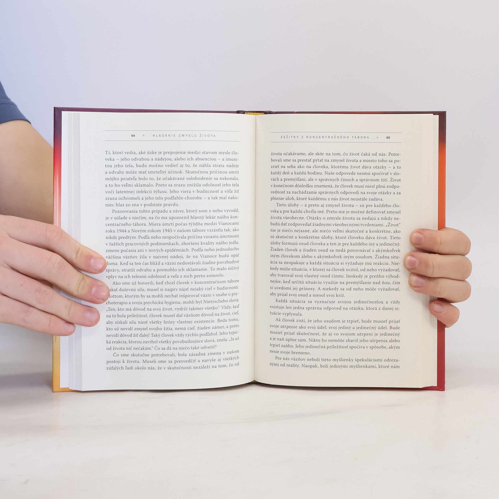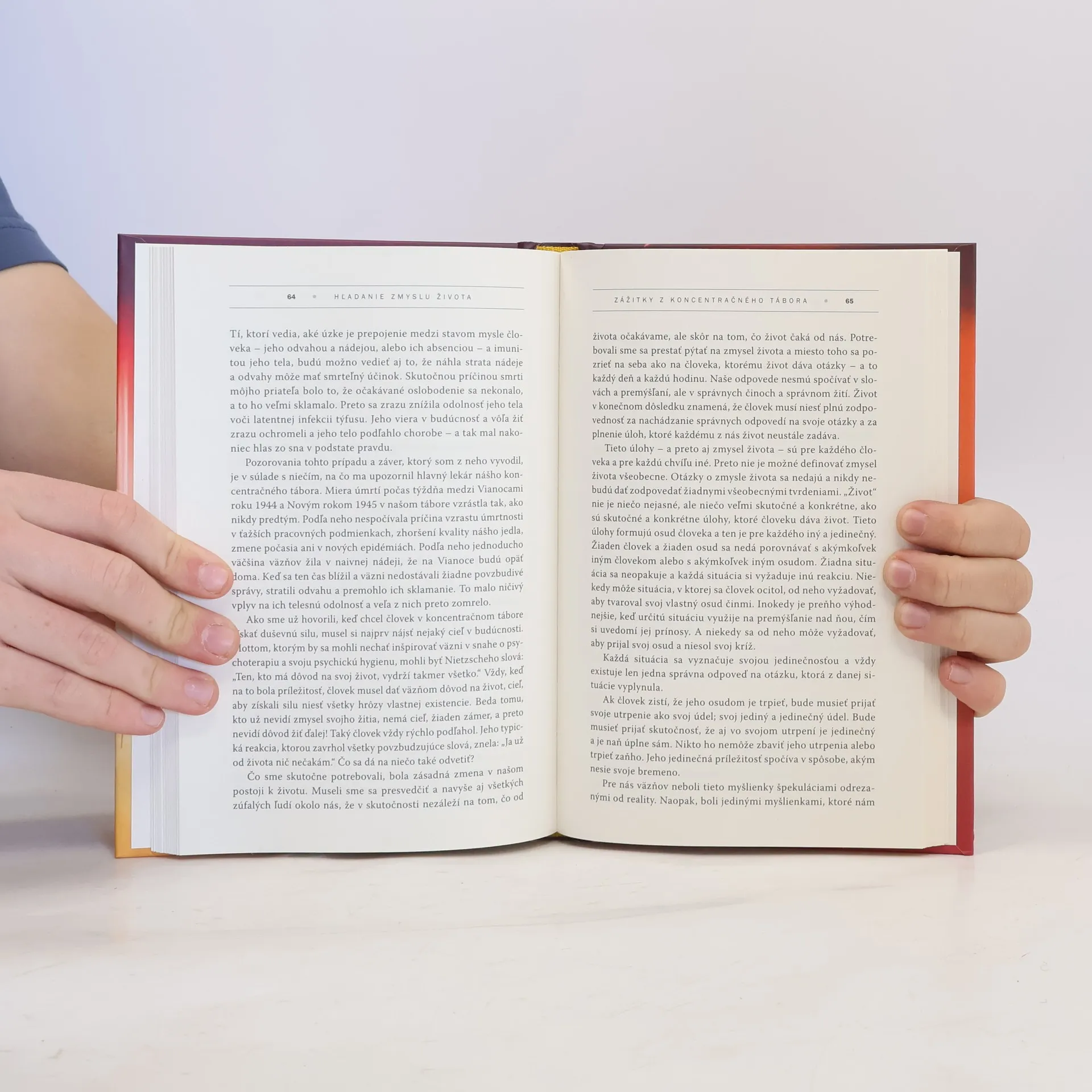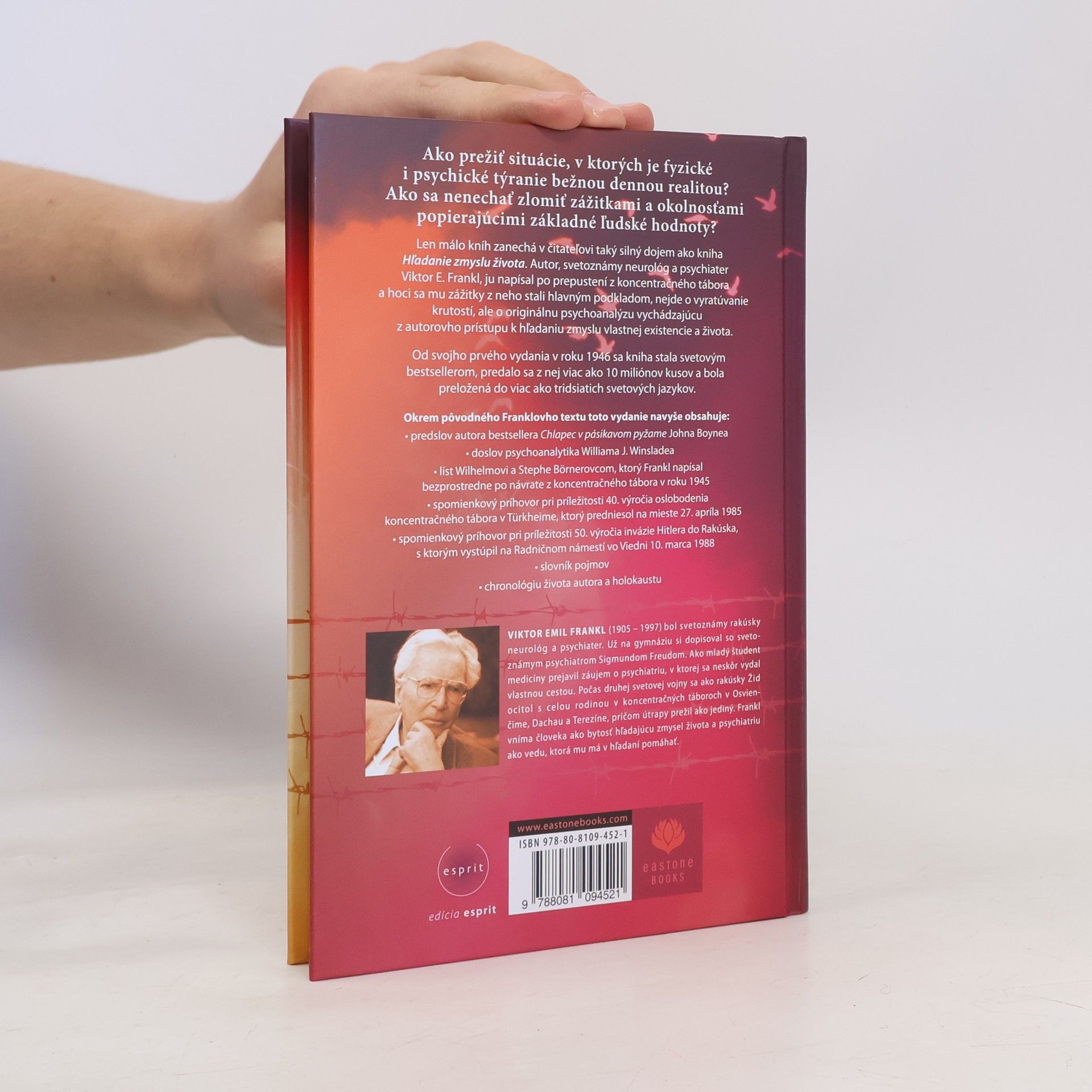 Len málo kníh zanechá v čitateľovi taký silný dojem ako táto. Autor, svetoznámy neurológ a psychiater, ju napísal po prepustení z koncentračného tábora, no nejde o vyratúvanie krutostí, ale o originálnu psychoanalýzu vychádzajúcu z autorovho prístupu k hľadaniu zmyslu vlastnej existencie a života. Doteraz sa z nej predalo viac ako 10 miliónov výtlačkov a bola preložená do vyše 30 jazykov. Toto vydanie navyše obsahuje: predslov autora bestsellera Chlapec v pásikavom pyžame, doslov psychoanalytika, list, ktorý Frankl napísal bezprostredne po návrate z koncentračného tábora v roku 1945, spomienkový príhovor pri príležitosti 40. výročia oslobodenia koncentračného tábora v Türkheime, spomienkový príhovor pri príležitosti 50. výročia invázie Hitlera do Rakúska, slovník pojmov a chronológiu života autora a holokaustu.