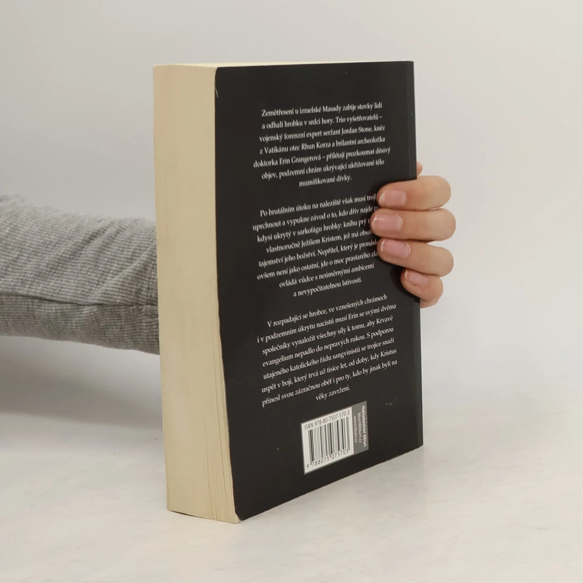 Přidat do mých knih KoupitKoupit eknihu Zemětřesení v izraelské Masadě zabije stovky lidí a odhalí hrobku v srdci hory. Trio vyšetřovatelů – seržant Jordan Stone, vojenský forenzní expert, otec Rhun Korza, kněz z Vatikánu a doktorka Erin Grangerová, brilantní, ale rozčarovaná archeoložka – jsou vysláni, aby prozkoumali děsivý objev, podzemní chrám ukrývající ukřižované tělo mumifikované dívky. Ale po brutálním útoku na naleziště musí uprchnout a vypukne závod o to, aby vrátili, co bylo kdysi ukryto v sarkofágu hrobky: knihu napsanou prý vlastnoručně Ježíšem Kristem, která má obsahovat tajemství jeho božství. Avšak nepřítel, který jim je v patách, není jako ostatní, jde o moc prastarého zla, které ovládá vůdce s neúměrnými ambicemi a nevypočitatelnou lstivostí. V rozpadající se hrobce i v okázalých chrámech musí Erin se svými společníky bojovat s minulostí vedoucí tisíce let zpět do doby, kdy v temných koutech světa lovily nečisté stvůry, až k okamžiku, kdy Kristus přinesl svou zázračnou oběť, smlouvu o spasení pro ty, kdo by jinak byli na věky zavrženi. Druhé vydání.