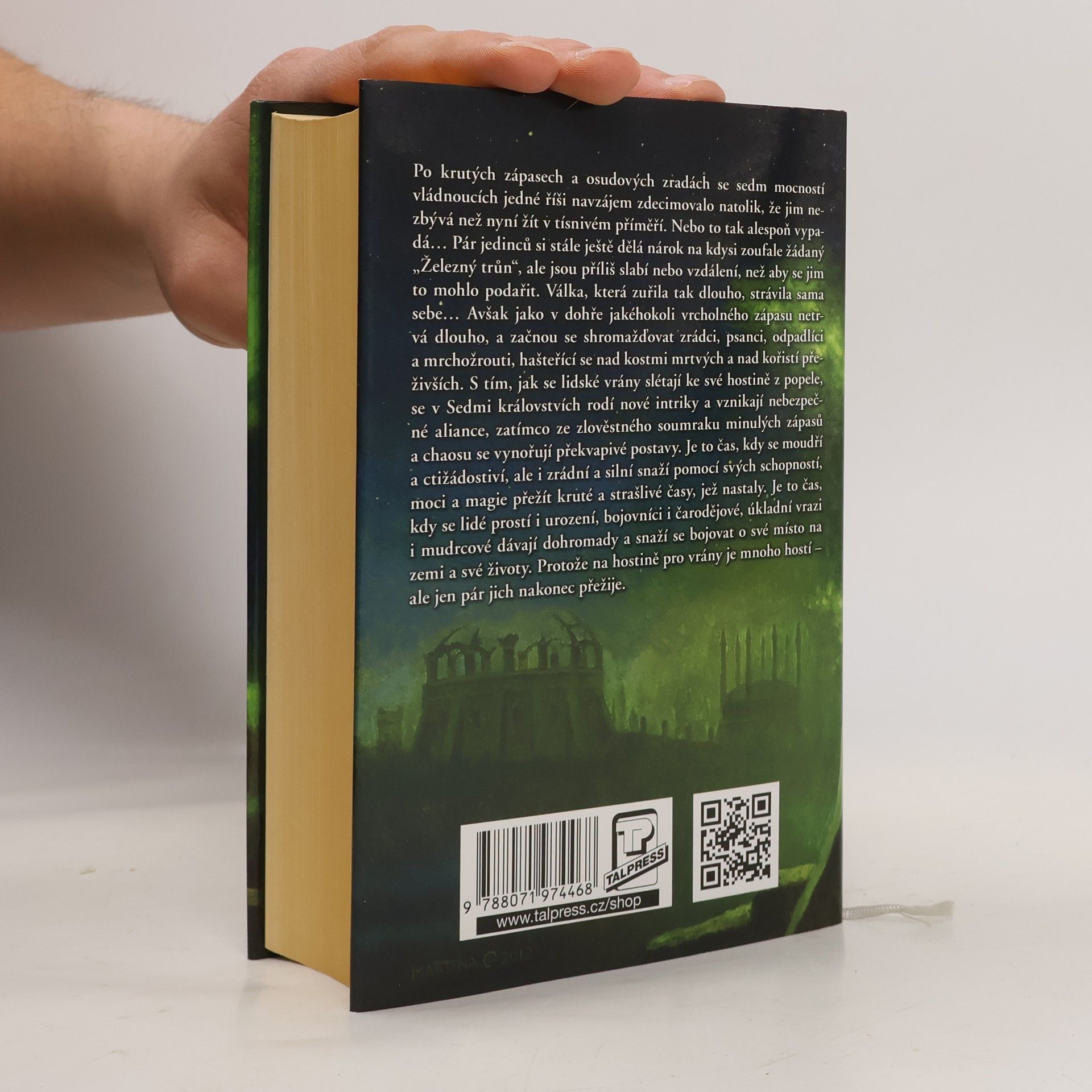 Po staletích krutých zápasů a osudových zrad se sedm mocností vládnoucích jedné říši navzájem zdecimovalo natolik, že jim nezbývá než nyní žít v tísnivém příměří. Nebo to tak alespoň vypadá… Pár jedinců si stále ještě dělá nárok na kdysi zoufale žádaný „Železný trůn“, ale jsou příliš slabí nebo vzdálení, než aby se jim to mohlo podařit. Válka, která zuřila tak dlouho, strávila sama sebe… Avšak jako v dohře jakéhokoli vrcholného zápasu netrvá dlouho, a začnou shromažďovat zrádci, psanci, odpadlíci a mrchožrouti, hašteřící se nad kostmi mrtvých a nad kořistí přeživších. S tím, jak se lidské vrány slétají ke své hostině z popele, se v Sedmi královstvích rodí nové intriky a vznikají nebezpečné aliance, zatímco ze zlověstného soumraku minulých zápasů a chaosu se vynořují překvapivé postavy. Je to čas, kdy se moudří a ctižádostiví, ale i zrádní a silní snaží pomocí svých schopností, moci a magie přežít kruté a strašlivé časy, jež nastaly. Je to čas, kdy se lidé prostí i urození, bojovníci i čarodějové, úkladní vrazi i mudrcové dávají dohromady a snaží se bojovat o své místo na zemi a své životy. Protože na hostině pro vrány je mnoho hostí – ale jen pár jich nakonec přežije.