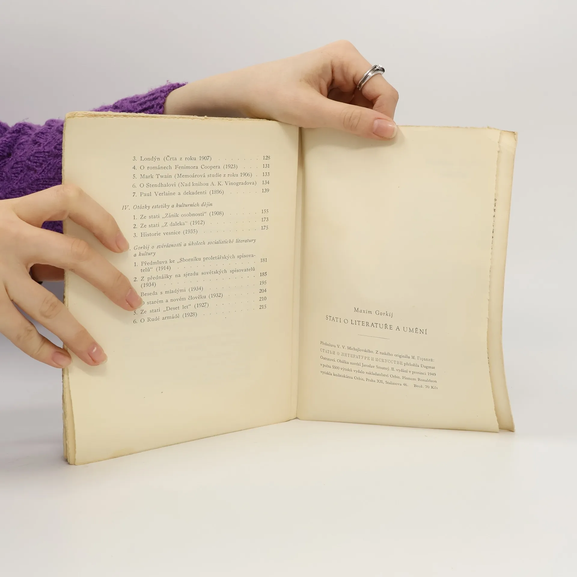 Výbor z Gorkého činnosti literárně kritické a z jeho publicistiky o otázkách kulturních a estetických je rozdělen do 5 částí: I. je věnována vzpomínkám na vlastní literární začátky, II. Tolstému a Čechovovi, III. otázce svět. literatury a někt. projevům kultury západní, IV. problémům estetickým a kulturně historickým a V. charakteristickým jevům sovětské literatury a Rudé armádě, jakožto škole rovněž kulturně vychovávající nadějnou mládež.