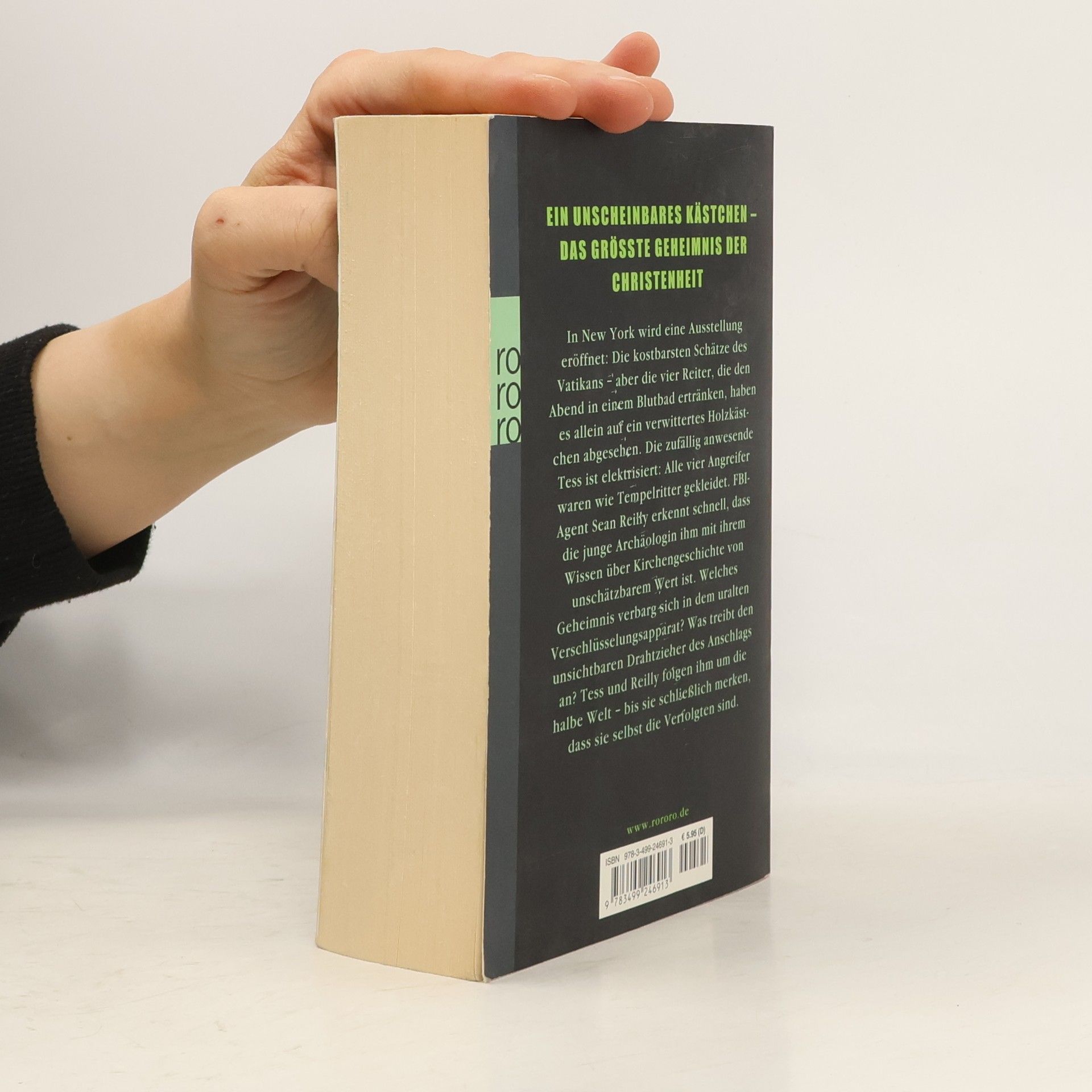 Ein unscheinbares Kästchen - das größte Geheimnis der Christenheit. In New York wird eine Ausstellung eröffnet: die kostbarsten Schätze des Vatikans – aber die vier Reiter, die den Abend in einem Blutbad ertränken, haben es allein auf ein verwittertes Holzkästchen abgesehen. Die zufällig anwesende Tess Chaykin ist elektrisiert: Die Angreifer waren wie mittelalterliche Tempelritter gekleidet. FBI-Agent Sean Reilly merkt schnell, dass die junge Archäologin ihm mit ihrem Wissen von unschätzbarem Wert ist. Welches Geheimnis verbarg sich in dem uralten Verschlüsselungsapparat? Was treibt den unsichtbaren Drahtzieher des Anschlags an? Tess und Reilly folgen ihm um die halbe Welt – am Ende erkennen sie, dass sie selbst die Verfolgten sind. DER WELT-BESTSELLER: EINE MILLION VERKAUFTE EXEMPLARE IN DEUTSCHLAND