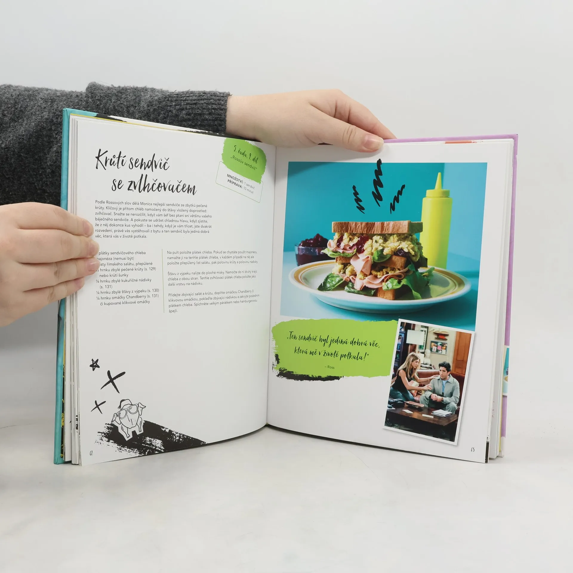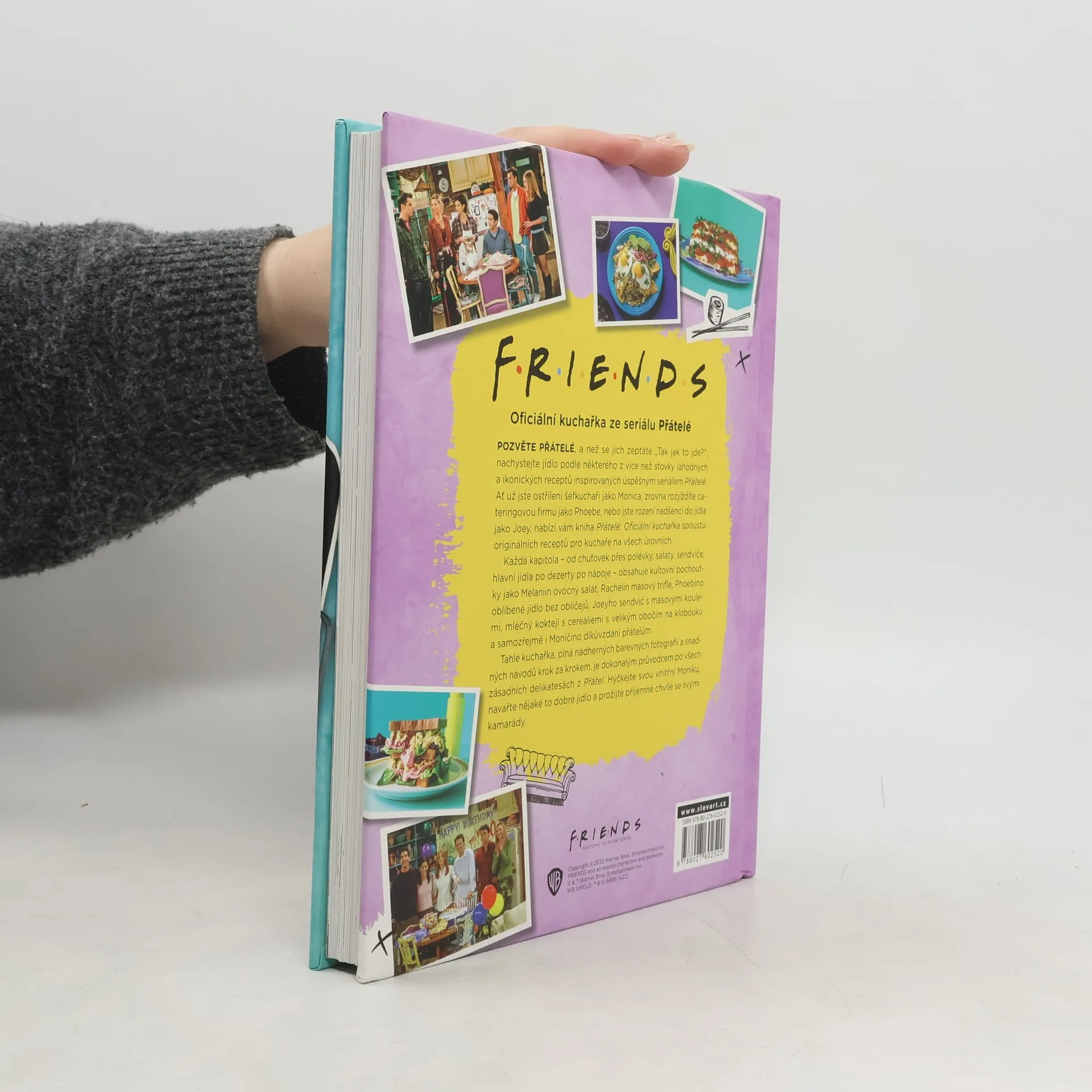 Pozvěte kamarády a nachystejte jídlo podle některého z více než stovky ikonických receptů inspirovaných úspěšným seriálem Přátelé. Když si znovu pustíte jednotlivé epizody, jistě si uvědomíte, že jídlo je jeden z pilířů lidské pospolitosti. Právě nadčasovost a uvěřitelnost příběhů odehrávajících se kolem jídla utkvěla v paměti fanouškům na celém světě. Ať už jste ostřílení šéfkuchaři jako Monica, rozjíždíte cateringovou firmu jako Phoebe, nebo jste rození fanatici jídla jako Joey, nabízíme vám spoustu originálních receptů pro kuchaře na všech úrovních. Každá kapitola - chuťovky, polévky, saláty, sendviče, hlavní jídla, dezerty a nápoje - nabízí kultovní pochoutky jako Rachelin masový trifle, Phoebiny kelímky s granitou, Joeyho sendvič s masovými koulemi, vejce pro Chandlera, Rossovy ruce pálící fajitas i Moničino díkůvzdání přátelům.Kuchařka plná barevných fotografií a snadných návodů je dokonalým průvodcem po všech zásadních delikatesách z Přátel.