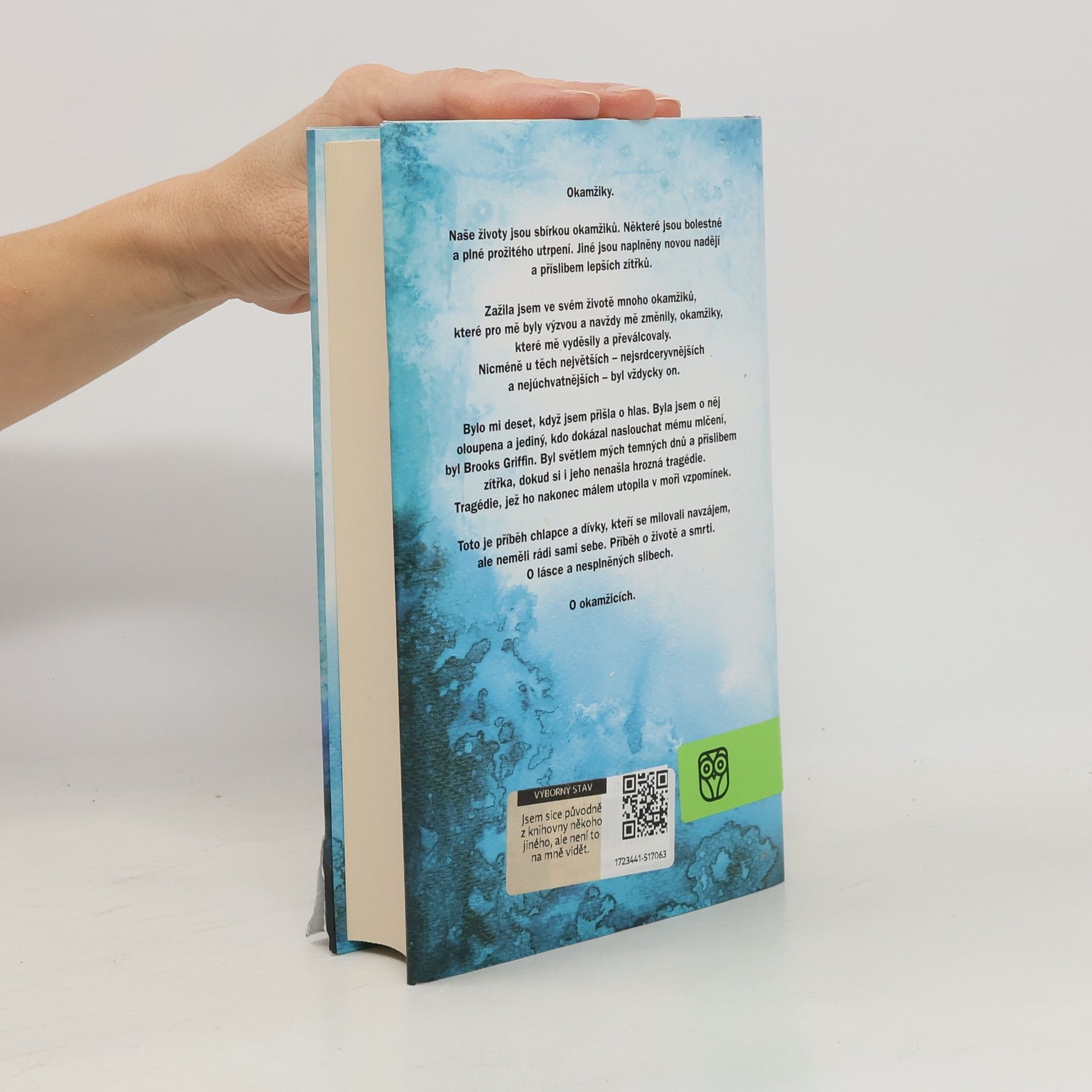 Okamžiky. Naše životy jsou sbírkou okamžiků. Některé jsou bolestné a plné prožitého utrpení. Jiné jsou naplněny novou nadějí a příslibem lepších zítřků. Zažila jsem ve svém životě mnoho okamžiků, které pro mě byly výzvou a navždy mě změnily, okamžiky, které mě vyděsily a převálcovaly. Nicméně, u těch největších – nejsrdceryvnějších a nejúchvatnějších – byl vždycky on. Bylo mi deset, když jsem přišla o hlas. Byla jsem o něj oloupena, a jediný, kdo dokázal naslouchat mému mlčení, byl Brooks Griffin. Byl světlem mých temných dnů a příslibem zítřka, dokud si i jeho nenašla hrozná tragédie. Tragédie, která ho nakonec málem utopila v moři vzpomínek. Toto je příběh chlapce a dívky, kteří se milovali navzájem, ale neměli rádi sami sebe. Příběh o životě a smrti. O lásce a nesplněných slibech. O okamžicích.