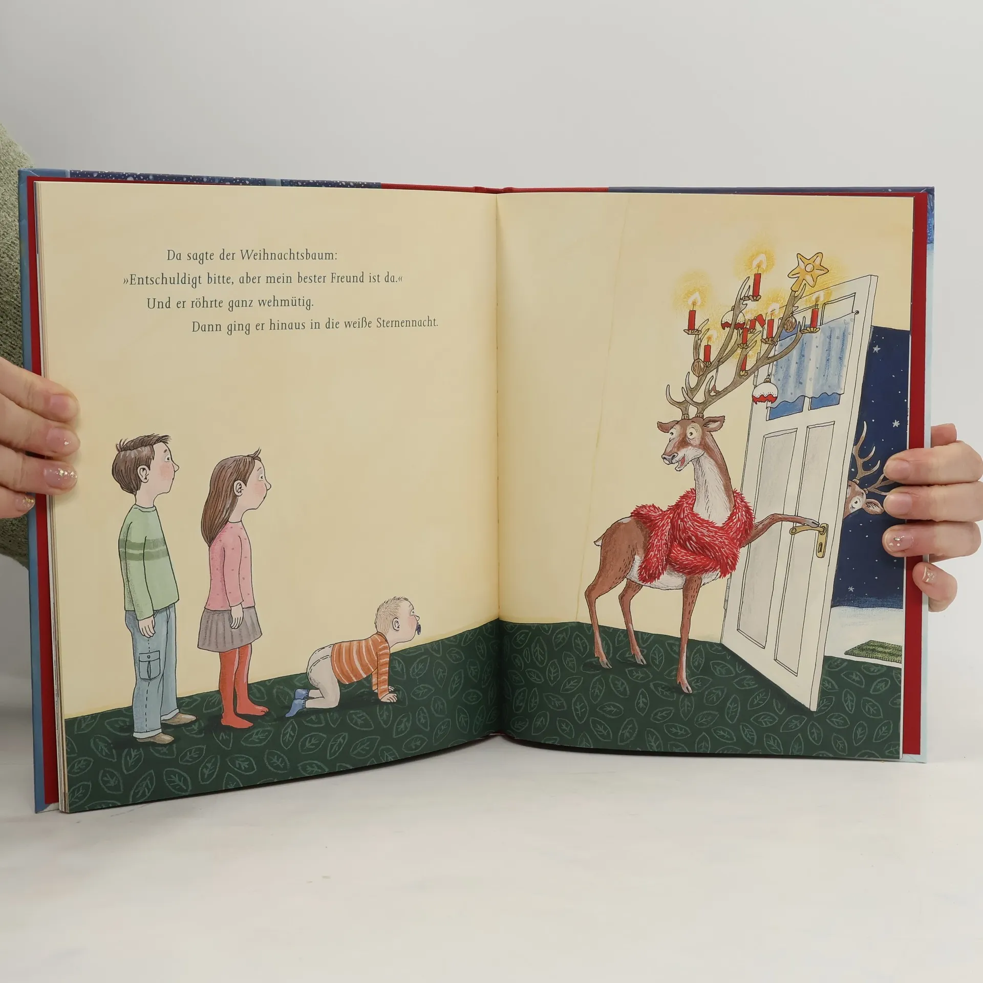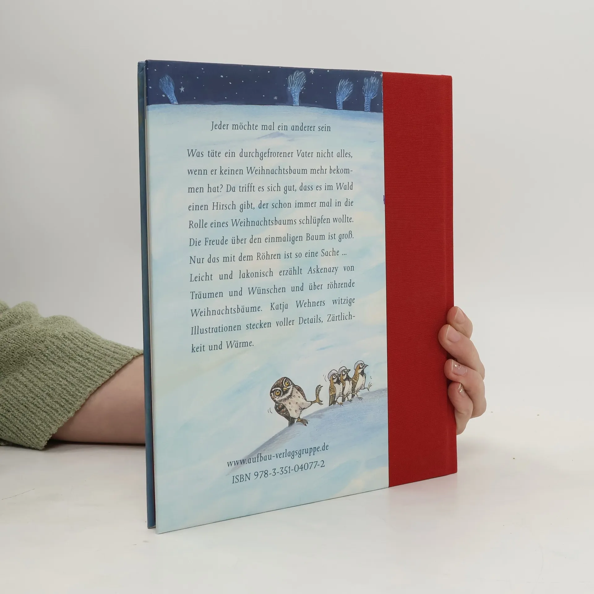 Ein Vater findet im Wald keinen Weihnachtsbaum und nimmt stattdessen einen Hirsch mit, der ein Weihnachtsbaum sein möchte. Der Hirsch muss versprechen, nicht zu röhren. Doch als ein Freund laut röhrt, wird das Geheimnis gefährdet. Eine liebevolle Weihnachtsgeschichte über Träume, meisterhaft erzählt von Askenazy und humorvoll illustriert von Katja Wehner.