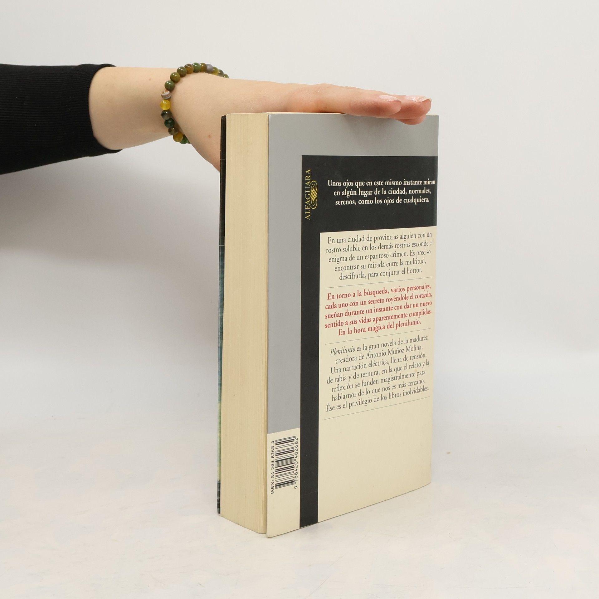 "Unos ojos que en este mismo instante miran en algún lugar de la ciudad, normales, serenos, como los ojos de cualquiera. En una ciudad de provincias alguien con un rostro soluble en los demás rostros esconde el enigma de un espantoso crimen. Es preciso encontrar su mirada entre la multitud, descifrarla, para conjurar el horror. En torno a la búsqueda, varios personajes, cada uno con un secreto royéndole el corazón, sueñan durante un instante con dar un nuevo sentido a sus vidas. En la hora mágica del plenilunio. Plenilunio es la gran novela de madurez creadora de Antonio Muñoz Molina. Una narración eléctrica, llena de tensión, de rabia y de ternura, en la que el relato y la reflexión se funden magistralmente para hablarnos de lo que nos es más cercano. Ése es el privilegio de los libros inolvidables. "
