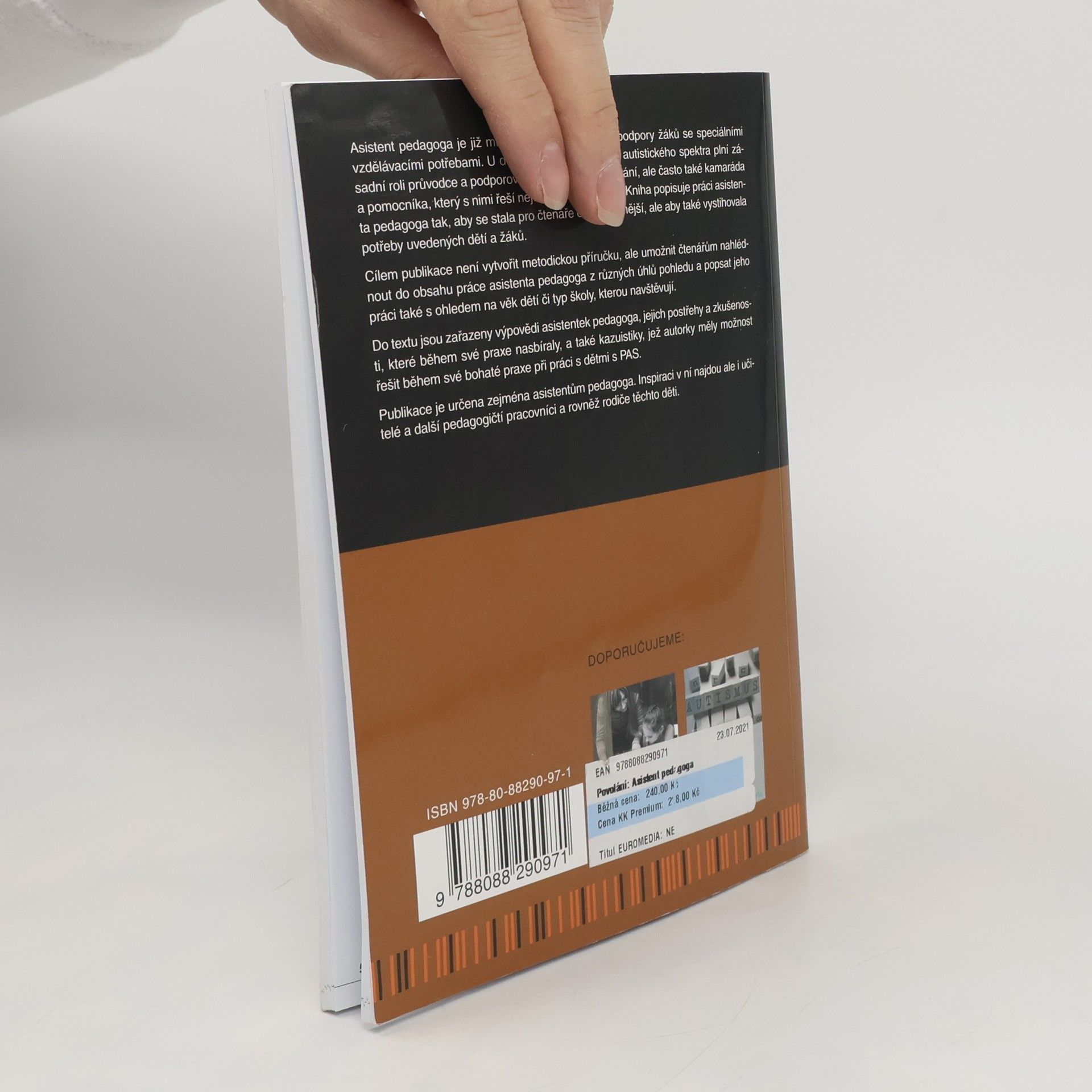 Kompetence asistenta pedagoga podporujícího žáky s poruchou autistického spektra. Asistent pedagoga je již mnoho let součástí přímé podpory žáků se speciálními vzdělávacími potřebami. U dětí a žáků s poruchami autistického spektra plní zásadní roli průvodce a podporovatele úskalími vzdělávání, ale často také kamaráda a pomocníka, který s nimi řeší nejen školní problémy. Kniha popisuje práci asistenta pedagoga tak, aby se stala pro čtenáře co nejreálnější, ale aby také vystihovala potřeby uvedených dětí a žáků. Cílem publikace není vytvořit metodickou příručku, ale umožnit čtenářům nahlédnout do obsahu práce asistenta pedagoga z různých úhlů pohledu a popsat jeho práci také s ohledem na věk dětí či typ školy, kterou navštěvují. Do textu jsou zařazeny výpovědi asistentek pedagoga, jejich postřehy a zkušenosti, které během své praxe nasbíraly, a také kazuistiky, jež autorky měly možnost řešit během své bohaté praxe při práci s dětmi s PAS. Publikace je určena zejména asistentům pedagoga. Inspiraci v ní najdou ale i učitelé a další pedagogičtí pracovníci a rovněž rodiče těchto děti.