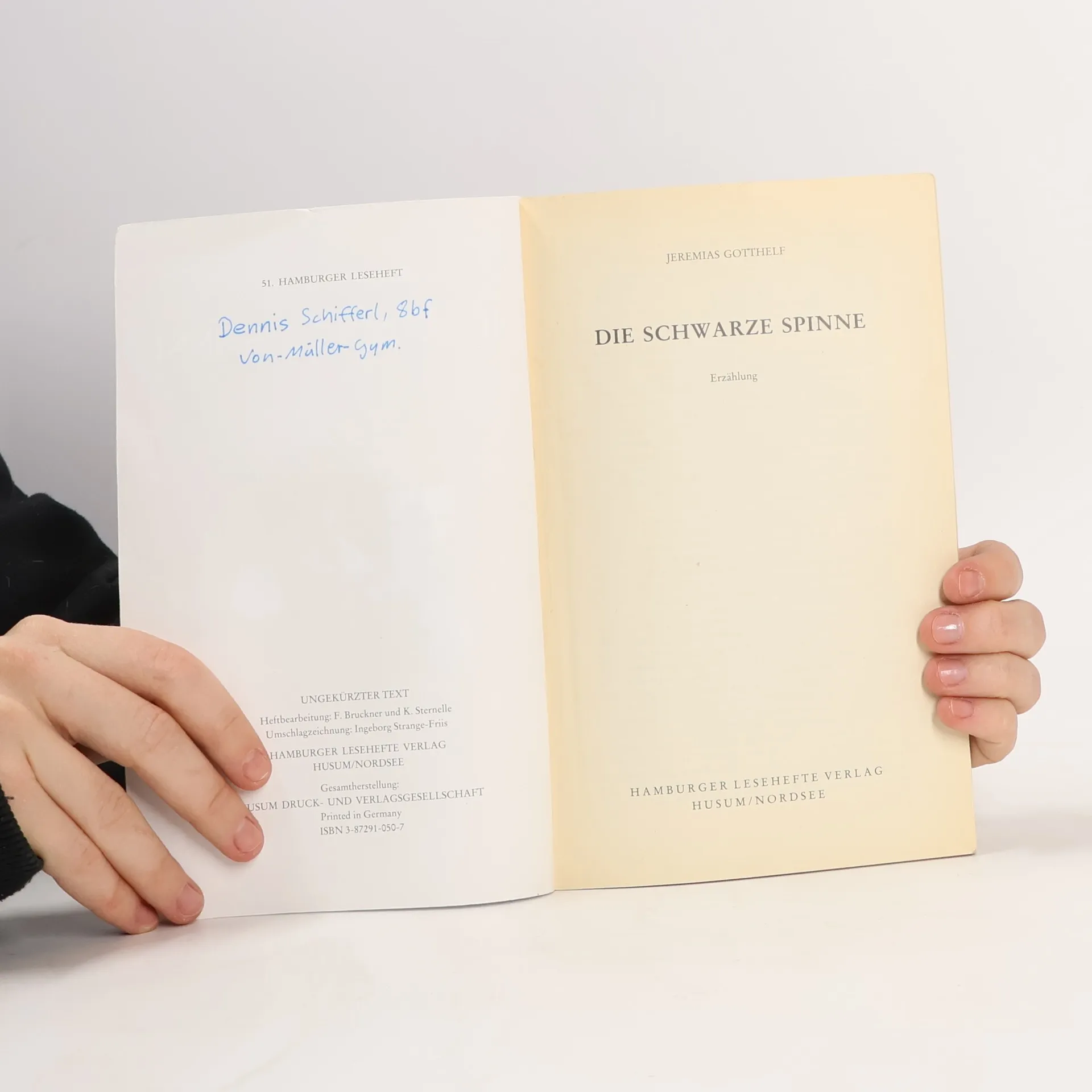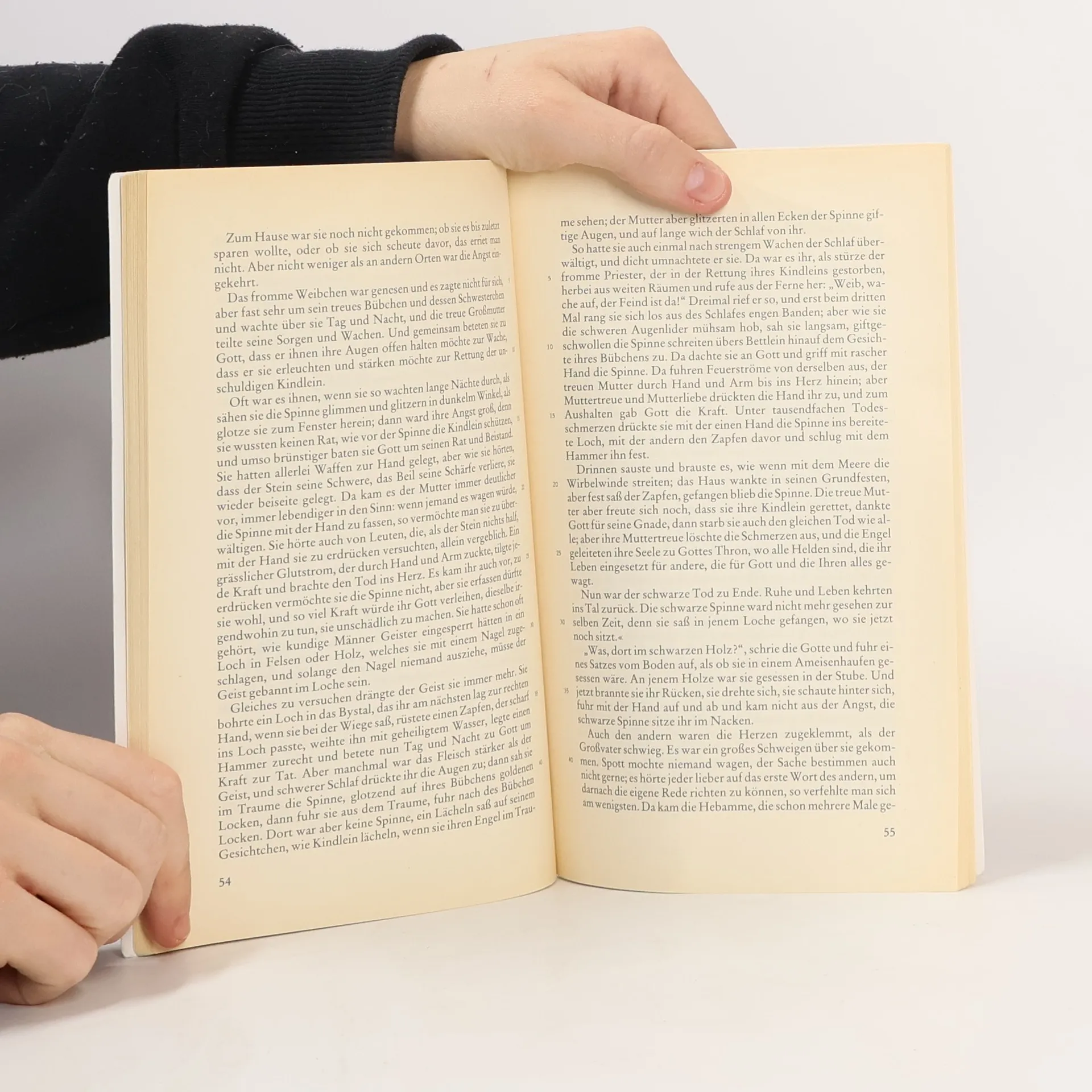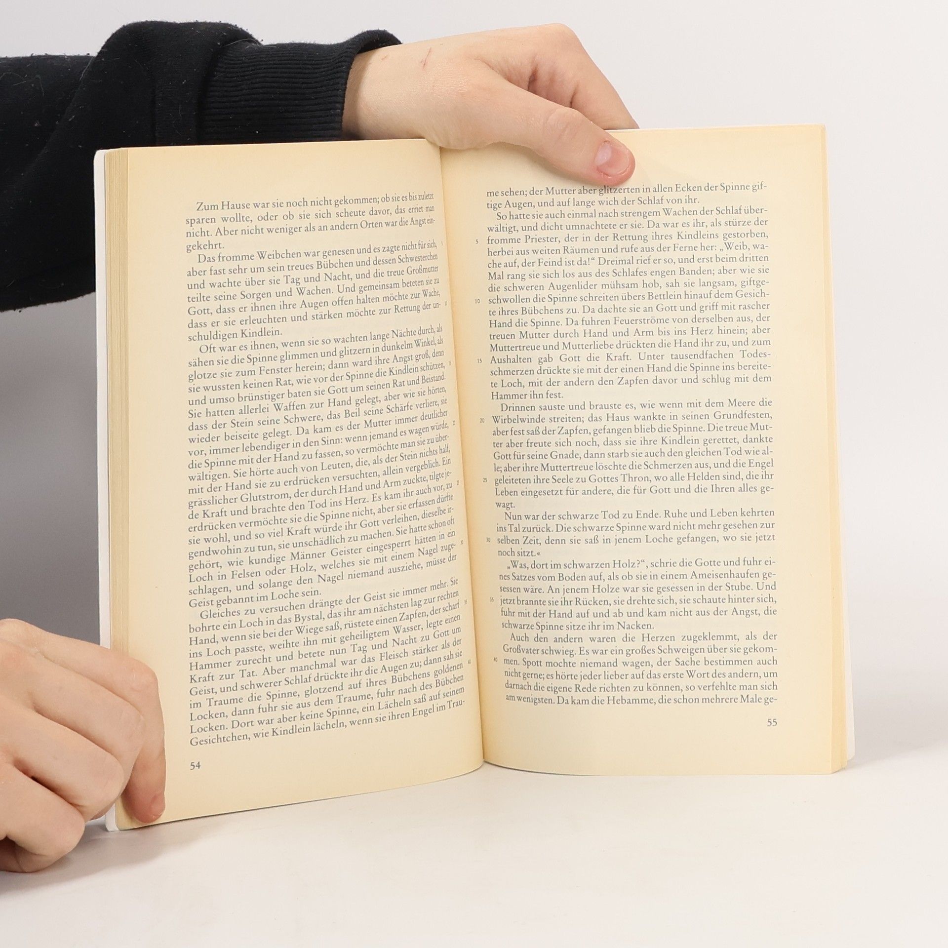 Für seine Hilfe beim Frondienst versprechen Bauern dem Teufel ein ungetauftes Kind. Als sie ihn um seinen Lohn prellen, rächt sich der Teufel mit einer Spinnenplage, der Mensch und Vieh zum Opfer fallen. Eine Mutter findet schliesslich die Kraft, des Unglücks Herr zu werden. Jahrhunderte später bricht die Plage durch Gottlosigkeit jedoch erneut aus. Als Vorlage diente dem Dichter eine Volkssage, von der zwei Varianten in dem Heft gebracht werden. Daten zur Entstehung der Novelle, eine Selbstbiografie des Dichters, sowie ausführliche Anmerkungen runden das Heft ab.