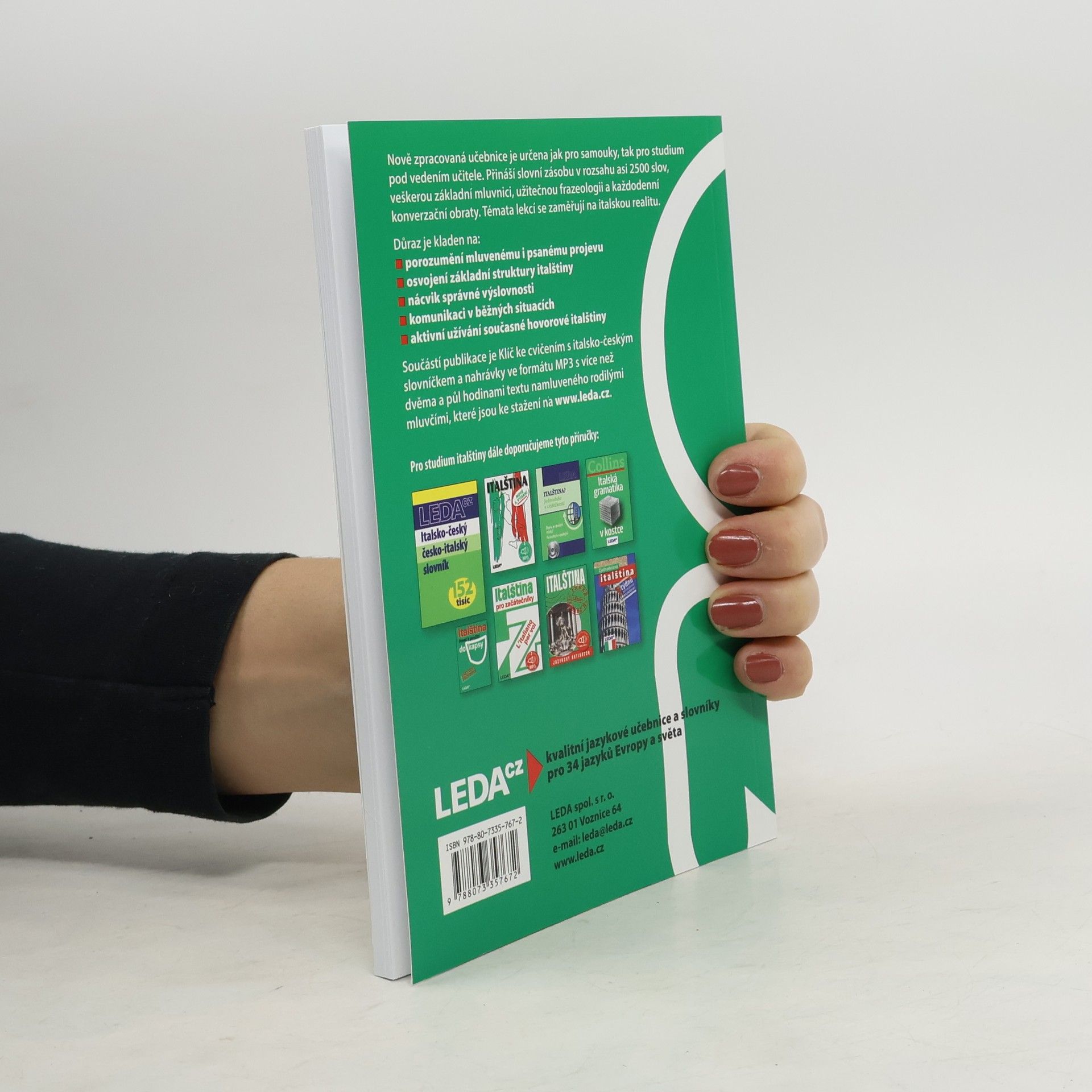 Nově zpracované sedmé vydání oblíbené učebnice pro samouky obsahuje italskou mluvnici, slovní zásobu v rozsahu asi 2500 slov, frazeologii a výslovnost. Důraz je kladen na aktivní užívání italštiny, schopnost dorozumět se a pohotově reagovat v nejčastějších situacích. Každou lekciuzavírají kvizy, které mají vzbudit zájem uživatele o kulturu Itálie. Učebnice je určena také pro kursy a školy. Její součástí je klíč ke cvičením s italsko-českým a česko-italským slovníčkem v samostatné brožuře a nahrávka vybraných textů v MP3, která je přístupná ke stažení na této stránce.
