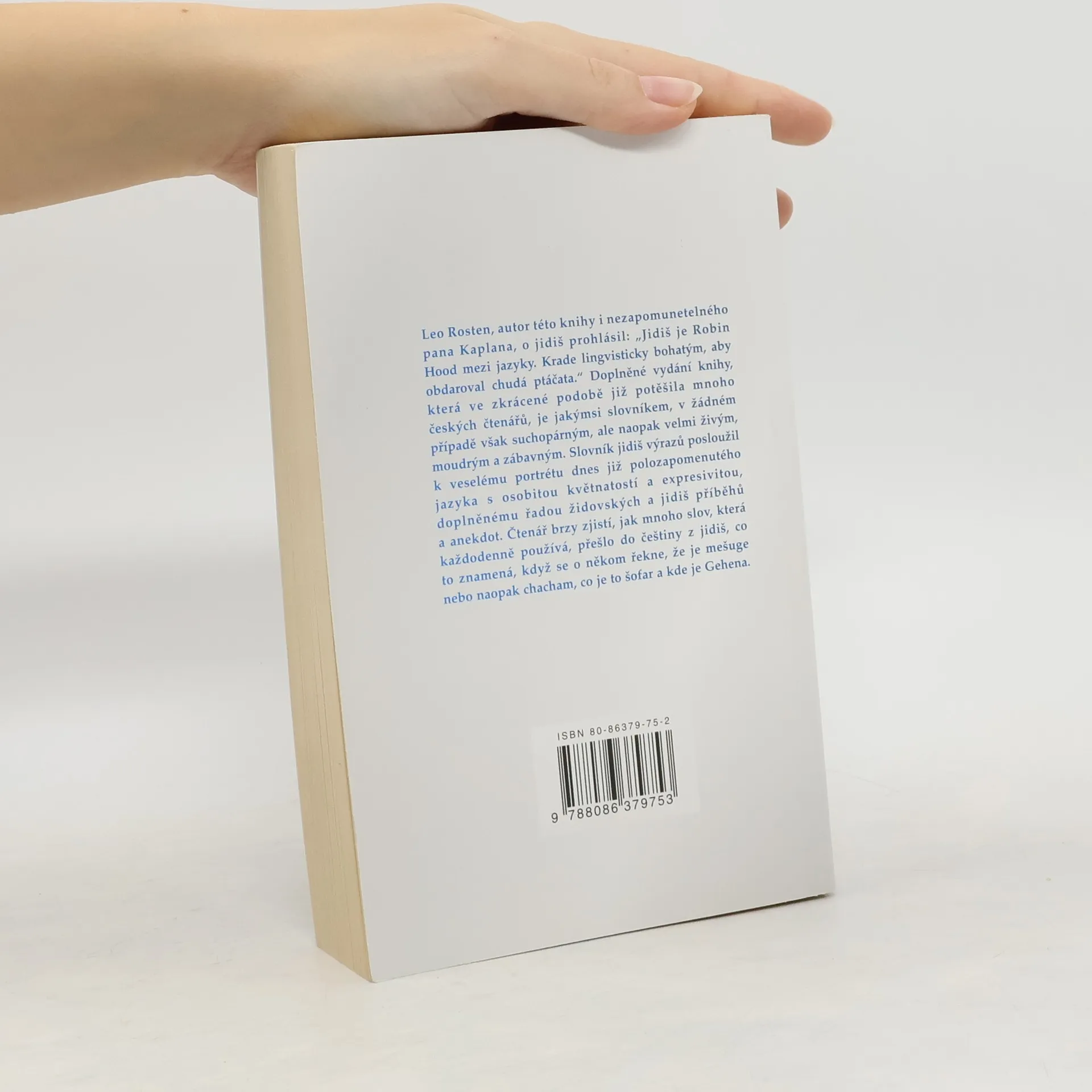 2., doplněné vydání. O jazyku jidiš Leo Rosten v předmluvě říká: „Jidiš je Robin Hood mezi jazyky. Krade lingvisticky bohatým, aby obdaroval chudá ptáčata.“ Nové, doplněné vydání knihy, která ve zkrácené podobě již potěšila mnoho českých čtenářů, je jakýmsi slovníkem, v žádném případě však suchopárným, ale naopak velmi živým, moudrým a zábavným. Slovník jidiš výrazů posloužil autorovi knih o učiteli angličtiny (Pan Kaplan má třídu rád) k veselému portrétu dnes již polozapomenutého jazyka s osobitou květnatostí a expresivitou, doplněnému řadou židovských a jidiš příběhů a anekdot. Čtenář brzy zjistí, jak mnoho slov, která každodenně používá, přešlo do češtiny z jidiš, co to znamená, když se o někom řekne, že je mešuge nebo naopak chachem, co je to šofar a kde je Gehena.