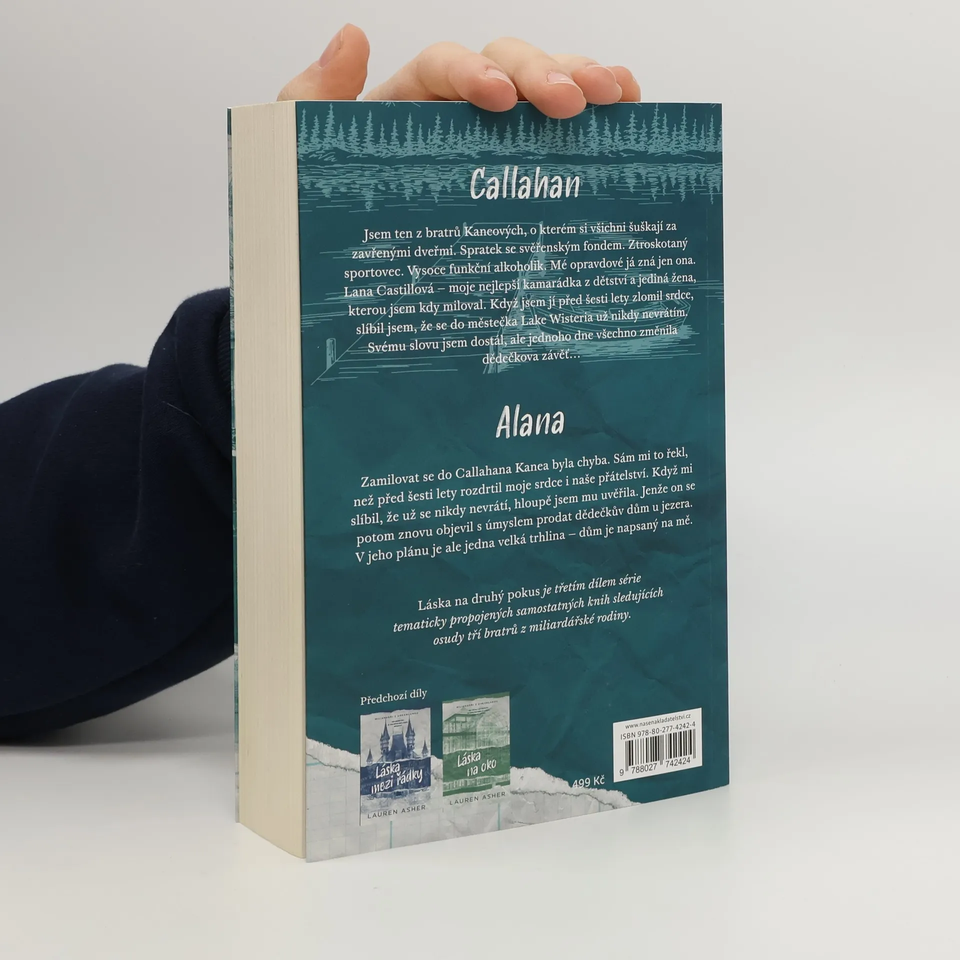 Callahan: Jsem ten z bratrů Kaneových, o kterém si všichni šuškají za zavřenými dveřmi. Spratek se svěřenským fondem. Ztroskotaný sportovec. Vysoce funkční alkoholik. Mé opravdové já zná jen ona. Lana Castillová – moje nejlepší kamarádka z dětství a jediná žena, kterou jsem kdy miloval. Když jsem jí před šesti lety zlomil srdce, slíbil jsem, že se do městečka Lake Wisteria už nikdy nevrátím. Svému slovu jsem dostál, ale jednoho dne všechno změnila dědečkova závěť. Jako podmínku k získání dědictví jsem dostal za úkol strávit léto v rodinném domě u jezera a potom ho prodat. Na první pohled se to zdálo jednoduché, ale můj plán šel hned první den ke dnu. Ukázalo se totiž, že Lana v domě nejen bydlí, ale dokonce je přesvědčená, že jí i patří. ----- Alana: Zamilovat se do Callahana Kanea byla chyba. Sám mi to řekl, než před šesti lety rozdrtil moje srdce i naše přátelství. Když mi slíbil, že už se nikdy nevrátí, hloupě jsem mu uvěřila. Jenže on se potom znovu objevil s úmyslem prodat dědečkův dům u jezera. V jeho plánu je ale jedna velká trhlina – dům je napsaný na mě. Láska na druhý pokus je třetím dílem série tematicky propojených samostatných knih sledujících osudy tří bratrů z miliardářské rodiny.