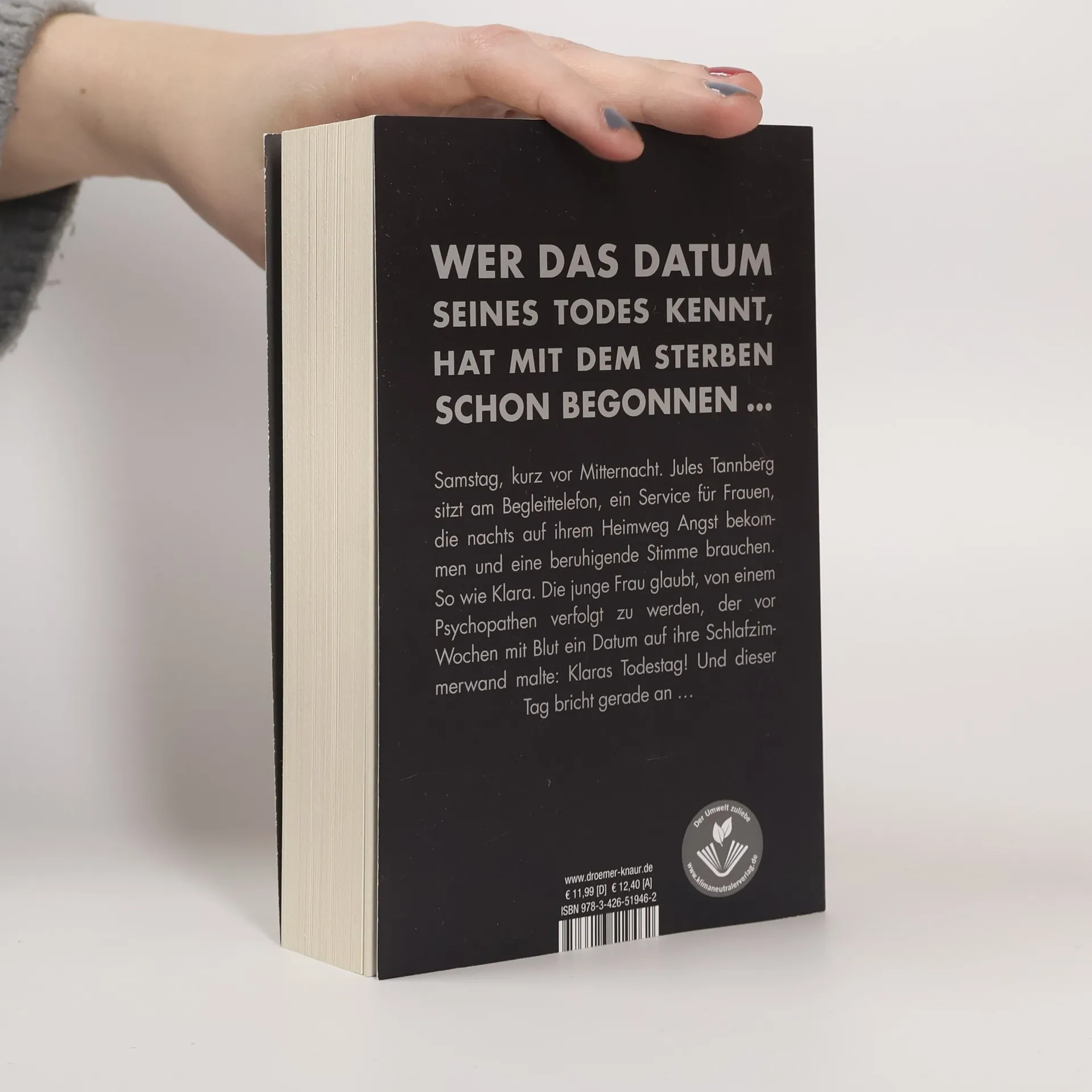 Wer das Datum seines Todes kennt, hat mit dem Sterben schon begonnen – dieser Bestseller von Sebastian Fitzek ist nichts für schwache Nerven! Es ist Samstag, kurz nach 22.00 Uhr. Jules Tannberg sitzt am Begleit-Telefon. Ein ehrenamtlicher Telefon-Service für Frauen, die zu später Stunde auf ihrem Heimweg Angst bekommen und sich einen telefonischen Begleiter wünschen, dessen beruhigende Stimme sie sicher durch die Berliner Nacht nach Hause führt - oder im Notfall Hilfe ruft. Noch nie gab es eine wirklich lebensgefährliche Situation. Bis heute, als Jules mit Klara spricht. Die junge Frau hat entsetzliche Angst. Sie glaubt, von einem Mann verfolgt zu werden, der sie schon einmal überfallen hat und der mit Blut ein Datum auf ihre Schlafzimmerwand malte: Klaras Todestag! Und dieser Tag bricht in nicht einmal zwei Stunden an ... Ein Serienmörder auf freiem Fuß – geheimnisvoll, beklemmend, nervenaufreibend: Einer der spannendsten Thriller aus der Feder des Bestsellerautors Sebastian Fitzek „Eines vermag dieser Autor wie kein Zweiter: eine Spannung aufzubauen, die zum Schluss schon fast als schmerzhaft empfunden wird.“ krimi-couch
