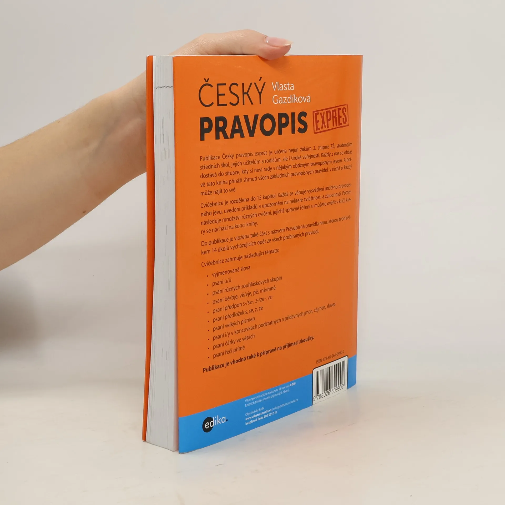 Jak si zlepšit pravopis. Kniha přináší shrnutí základních pravopisných pravidel, což ocení nejen žáci 2. stupně ZŠ připravující se na přijímací zkoušky, ale také středoškolští studenti, jejich učitelé, rodiče a celá široká veřejnost. Každý z nás při psaní občas zaváhá a neví si rady s některým obtížnějším pravopisným jevem. Každá z 15 kapitol se věnuje vysvětlení určitého pravopisného jevu, přináší příklady a upozornění na jazykové zvláštnosti. Dále následuje řada cvičení, jejichž správné řešení si můžete ověřit v klíči.