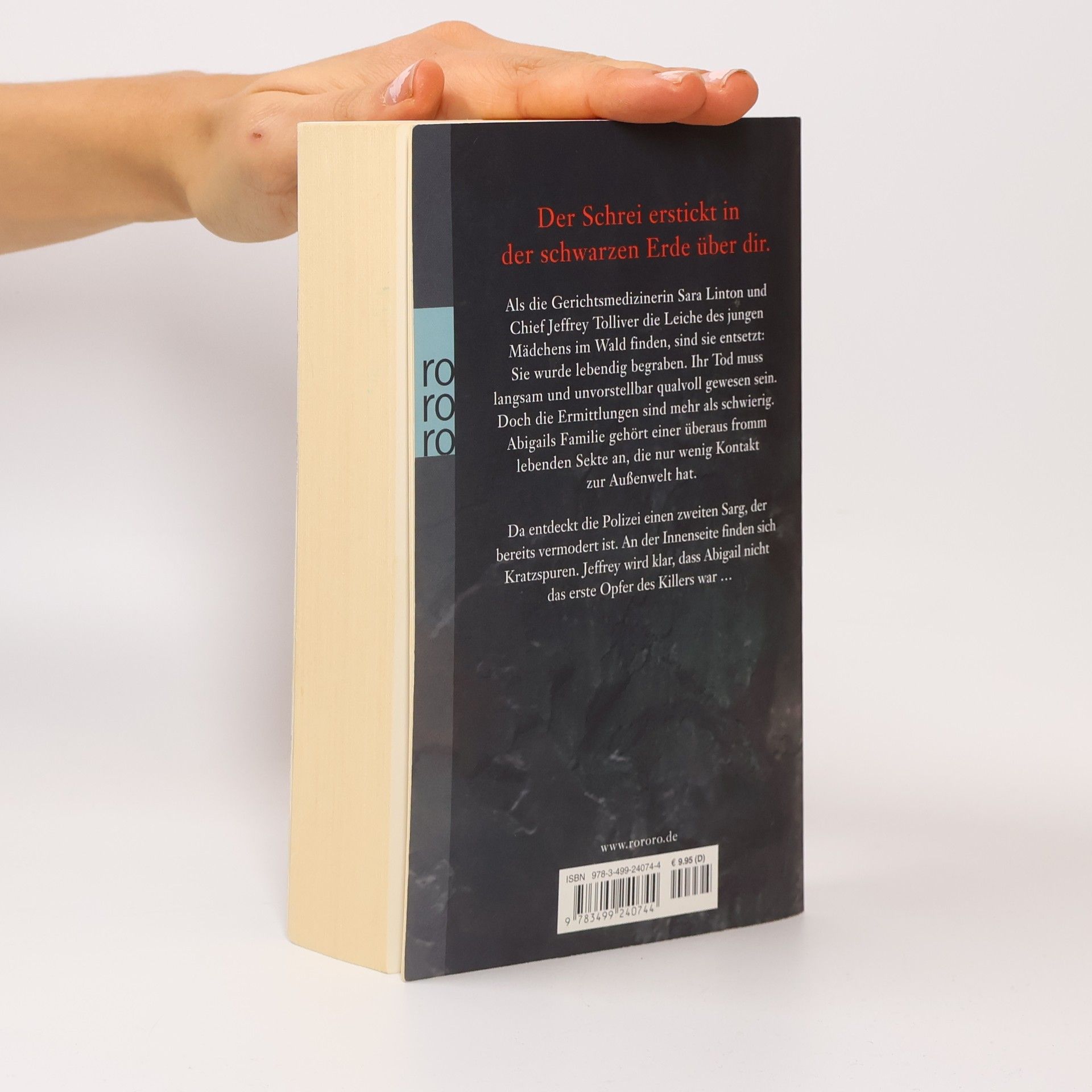 Dein Schrei erstickt in der schwarzen Erde über dir.Als die Gerichtsmedizinerin Sara Linton und Chief Jeffrey Tolliver die Leiche des jungen Mädchens im Wald finden, sind sie entsetzt: Sie wurde lebendig begraben. Ihr Tod muss langsam und unvorstellbar qualvoll gewesen sein. Doch die Ermittlungen sind mehr als schwierig. Abigails Familie gehört einer überaus fromm lebenden Sekte an, die nur wenig Kontakt zur Außenwelt hat.Da entdeckt die Polizei einen zweiten Sarg, der bereits vermodert ist. An der Innenseite finden sich Kratzspuren. Jeffrey wird klar, dass Abigail nicht das erste Opfer des Killers war…