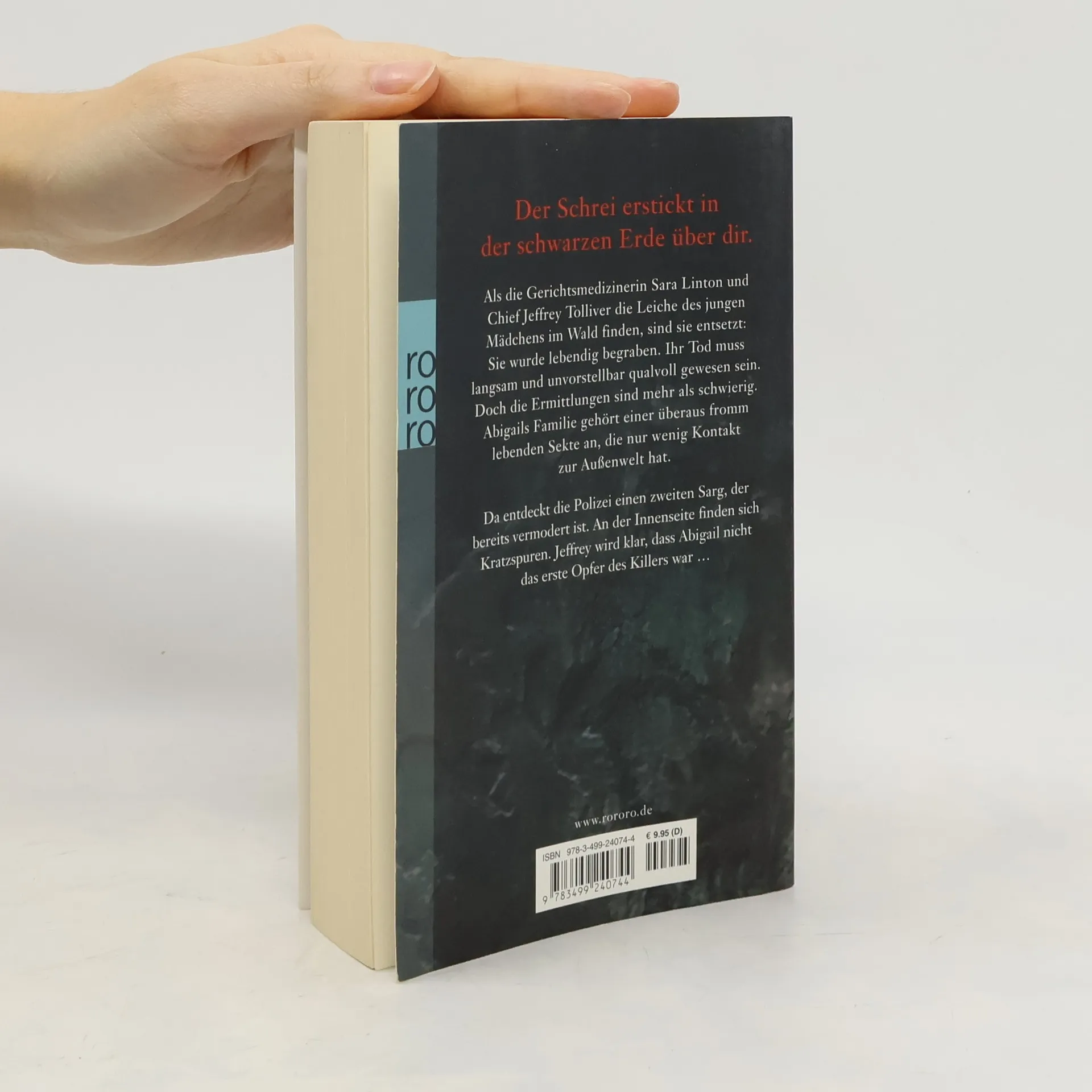Dein Schrei erstickt in der schwarzen Erde über dir.Als die Gerichtsmedizinerin Sara Linton und Chief Jeffrey Tolliver die Leiche des jungen Mädchens im Wald finden, sind sie entsetzt: Sie wurde lebendig begraben. Ihr Tod muss langsam und unvorstellbar qualvoll gewesen sein. Doch die Ermittlungen sind mehr als schwierig. Abigails Familie gehört einer überaus fromm lebenden Sekte an, die nur wenig Kontakt zur Außenwelt hat.Da entdeckt die Polizei einen zweiten Sarg, der bereits vermodert ist. An der Innenseite finden sich Kratzspuren. Jeffrey wird klar, dass Abigail nicht das erste Opfer des Killers war…