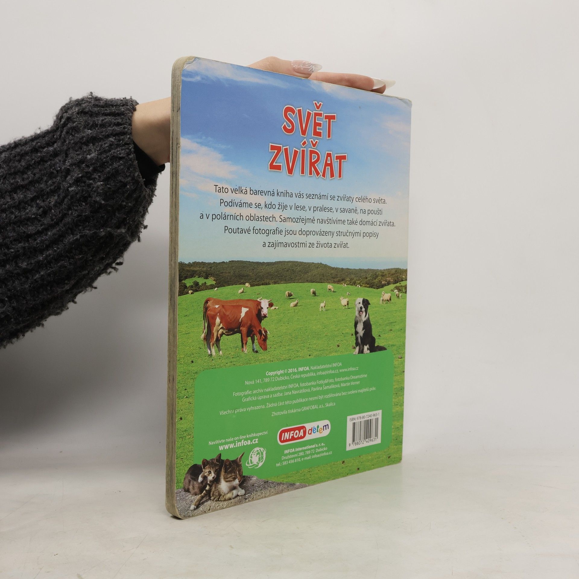 Tato velká barevná kniha vás seznámí se zvířaty celého světa. Podíváme se, kdo žije v lese, v pralese, v savaně, na poušti a v polárních oblastech. Samozřejmě navštívíme také domácí zvířata. Poutavé fotografie jsou doprovázeny stručnými popisy a zajímavostmi ze života zvířat.