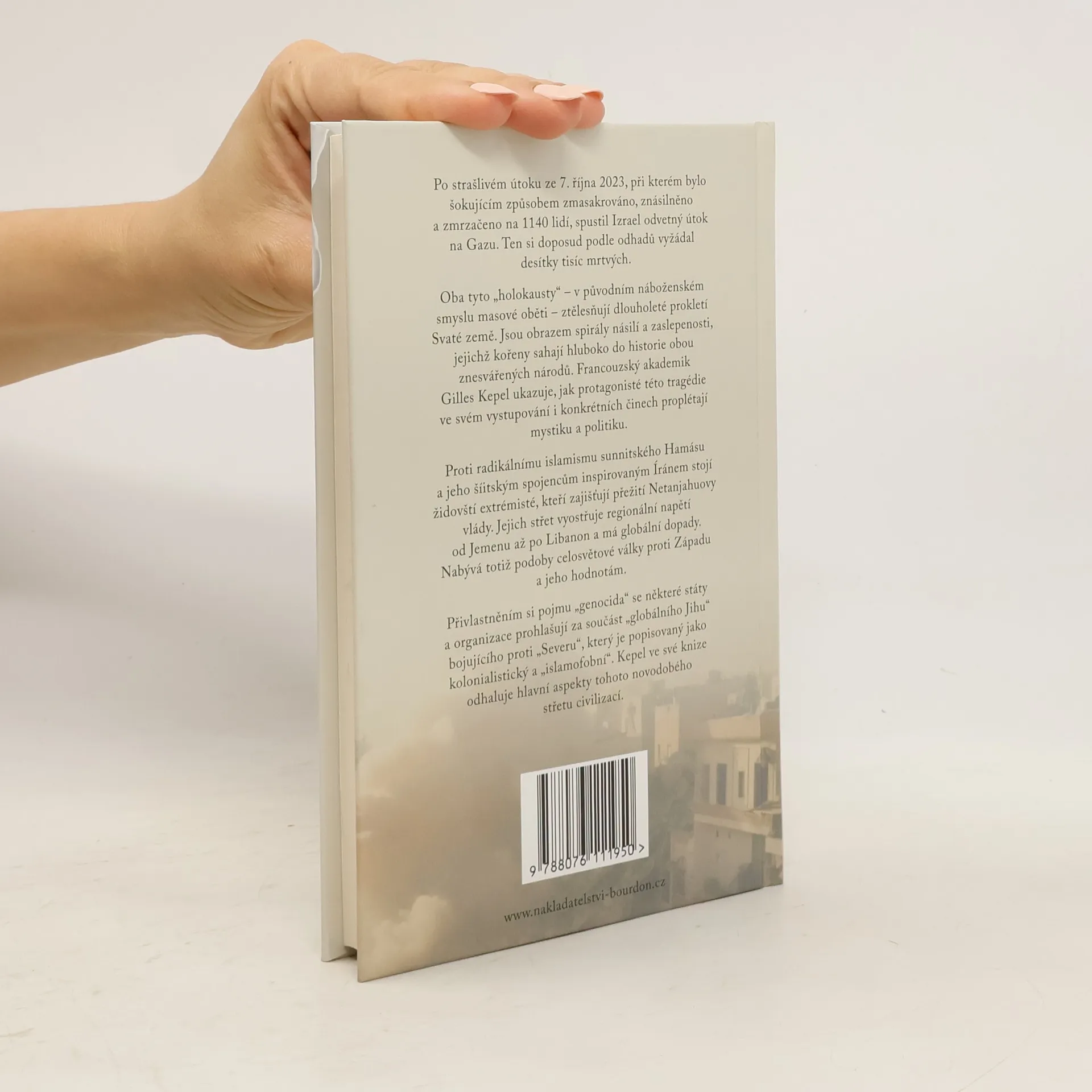 Po strašlivém útoku ze 7. října 2023, při kterém bylo šokujícím způsobem zmasakrováno, znásilněno a zmrzačeno na 1 140 lidí, spustil Izrael odvetný útok na Gazu. Ten si doposud podle odhadů vyžádal desítky tisíc mrtvých. Oba tyto holokausty – v původním náboženském smyslu masovéoběti – ztělesňují dlouholeté prokletí Svaté země. Jsou obrazem spirály násilí a zaslepenosti, jejichž kořeny sahají hluboko do historie obou znesvářených národů. Francouzský akademik Gilles Kepel ukazuje, jak protagonisté této tragédie ve svém vystupování i konkrétních činech proplétají mystiku a politiku. Proti radikálnímu islamismu sunnitského Hamásu a jeho šíitským spojencům inspirovaným Íránem stojí židovští extrémisté, kteří zajišťují přežití Netanjahuovy vlády. Jejich střet vyostřuje regionální napětí od Jemenu až po Libanon a má globální dopady. Nabývá totiž podoby celosvětové války proti Západu a jeho hodnotám. Přivlastněním si pojmu „genocida“ se některé státy a organizace prohlašují za součást „globálního Jihu“ bojujícího proti „Severu“, který je popisovaný jako kolonialistický a „islamofobní“. Kepel ve své knize odhaluje hlavní aspekty tohoto novodobého střetu civilizací.