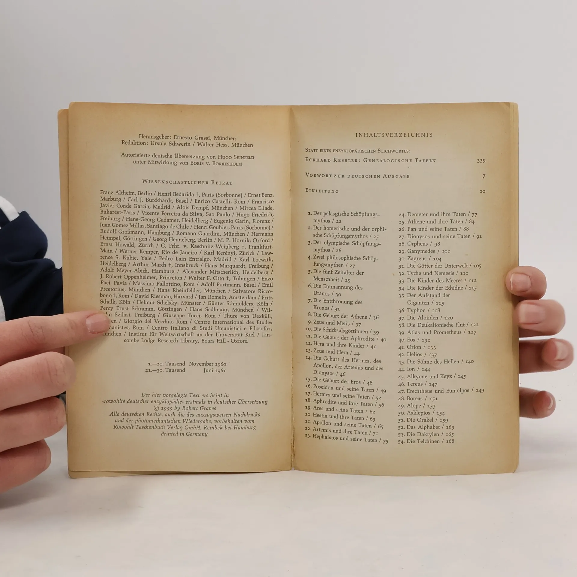 Von dem pelasgischen Schöpfungsmythos bis zur Heimekehr des Odysseus handeln die 171 Kapitel der «Griechischen Mythologie», jener «erzählerischen Kurzschrift kultischer Spiele, wie sie bei öffentlichen Festen aufgeführt wurden» so Robert von Ranke-Graves’ Definition des «echten Mythos». Sein 1955 in England erschienenes, 1960 erstmals bei Rowohlt herausgekommenes Standardwerk sammelt die verstreuten Elemente jeder einzelnen Mythe in einer harmonischen Erzählung, unterstützt diese durch weniger bekannte Variationen in ihrer Bedeutung (mit Anmerkungen und Quellenangaben) und beantwortet die auftauchenden Fragen in anthropologischen und historischen Begriffen (Interpretation). Genealogische Tafeln und das Namenregister erleichtern dabei die Orientierung, die ergänzten Literaturhinweise regen zur Weiterbeschäftigung an – auf der Suche nach uns selbst, die im griechischen Mythos auf eine faszinierende Weise bereits vorgezeichnet ist.