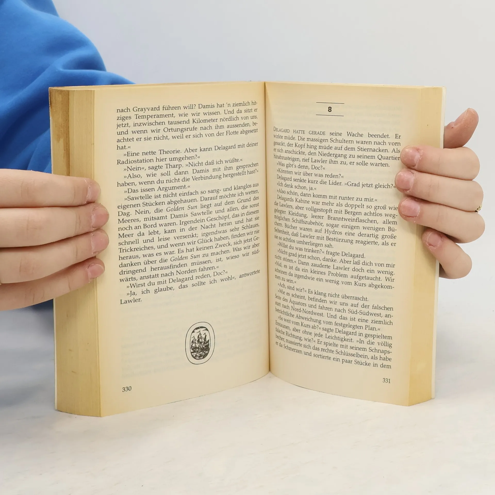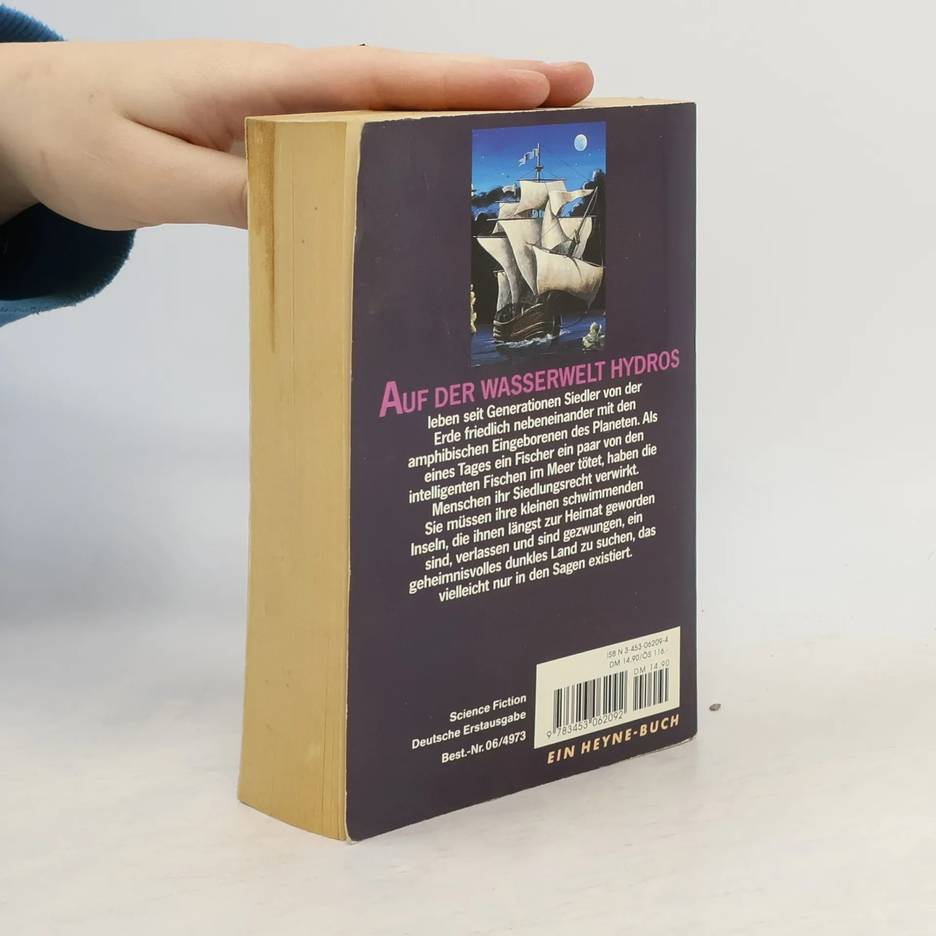 AUF DER WASSERWELT HYDROS leben seit Generationen Siedler von der Erde friedlich nebeneinander mit den amphibischen Eingeborenen des Planeten. Als eines Tages ein Fischer ein paar von den intelligenten Fischen im Meer tötet, haben die Menschen ihr Siedlungsrecht verwirkt. Sie müssen ihre kleinen schwimmenden Inseln, die ihnen längst zur Heimat geworden sind, verlassen und sind gezwungen, ein geheimnisvolles dunkles Land zu suchen, das vielleicht nur in den Sagen existiert. Science Fiction Deutsche Erstausgabe