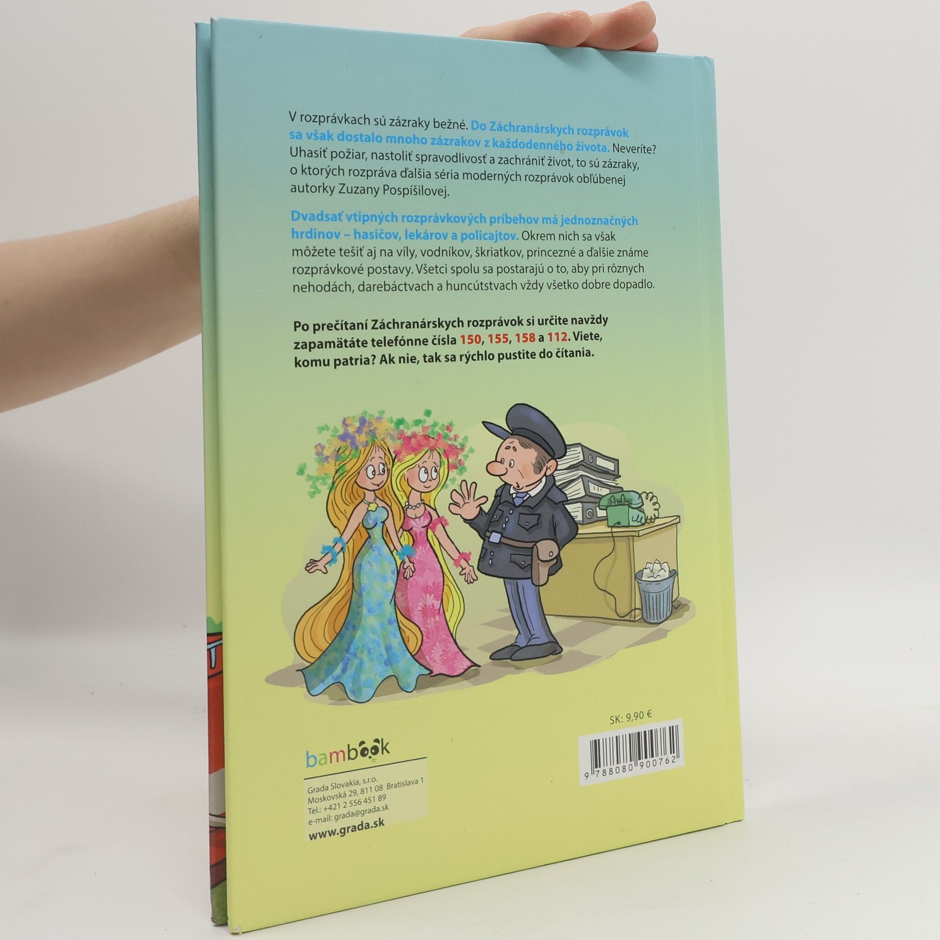 V rozprávkach sú zázraky bežné. Do Záchranárskych rozprávok sa však dostalo mnoho zázrakov z každodenného života. Neveríte?Uhasiť požiar, nastoliť spravodlivosť a zachrániť život, to sú zázraky, o ktorých rozpráva ďalšia séria moderných rozprávok obľúbenej autorky Zuzany Pospíšilovej.Dvadsať vtipných rozprávkových príbehov má jednoznačných hrdinov – hasičov, lekárov a policajtov. Okrem nich sa však môžete tešiť aj na víly, vodníkov, škriatkov, princezné a ďalšie známe rozprávkové postavy. Všetci spolu sa postarajú o to, aby pri rôznych nehodách, darebáctvach a huncútstvach vždy všetko dobre dopadlo.Po prečítaní Záchranárskych rozprávok si určite navždy zapamätáte telefónne čísla 150, 155, 158 a 112. Viete, komu patria? Ak nie, tak sa rýchlo pustite do čítania.